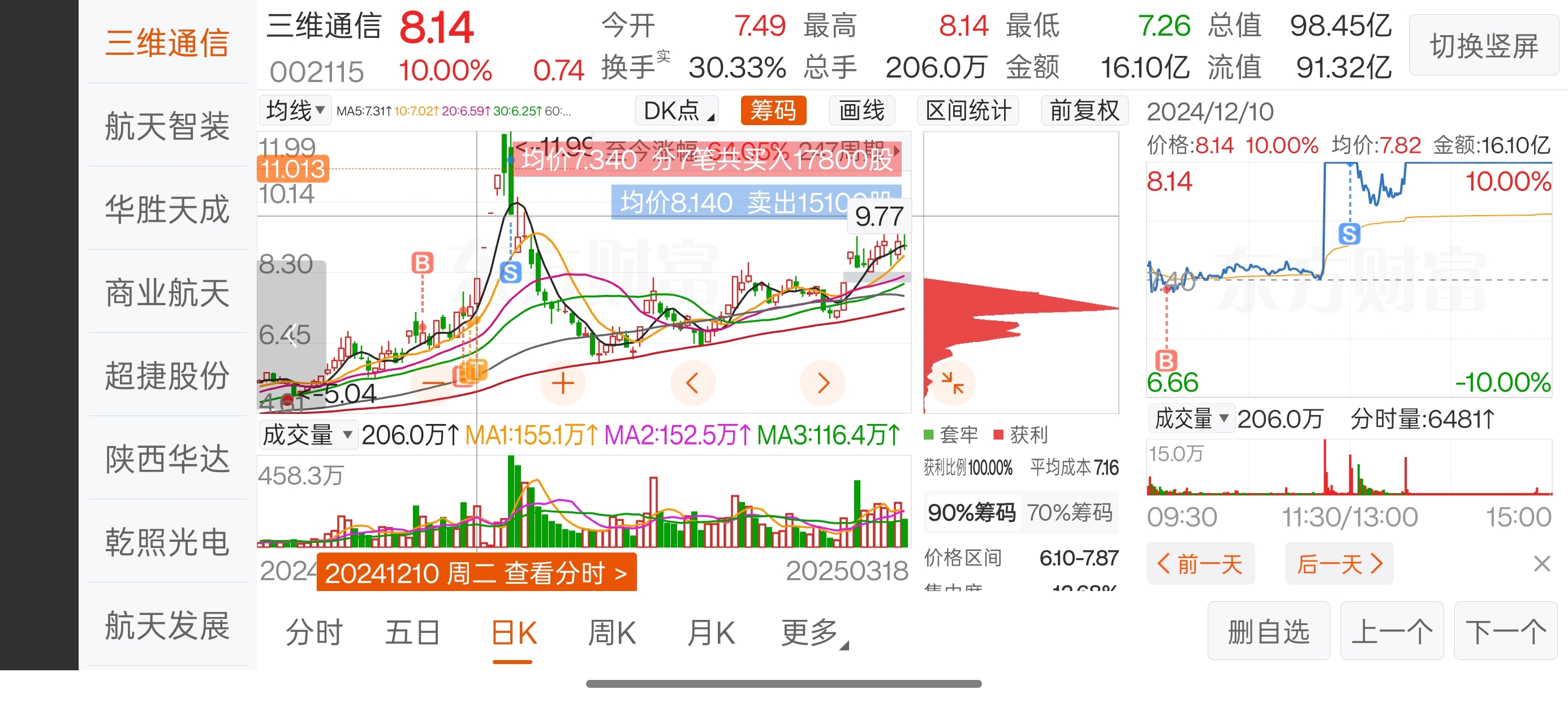 $三维通信(SZ002115)$ 又搞这炸板这手是吧,去年连板那波行情就是炸板洗了我大半仓,今天涨停无论怎么开我也不走了,早盘拉消费砸航天,后来消费砸了航天回流,三维这一波航天主线没涨过,被资金盯上了做了个高低切,肯定不是一个板这么简单