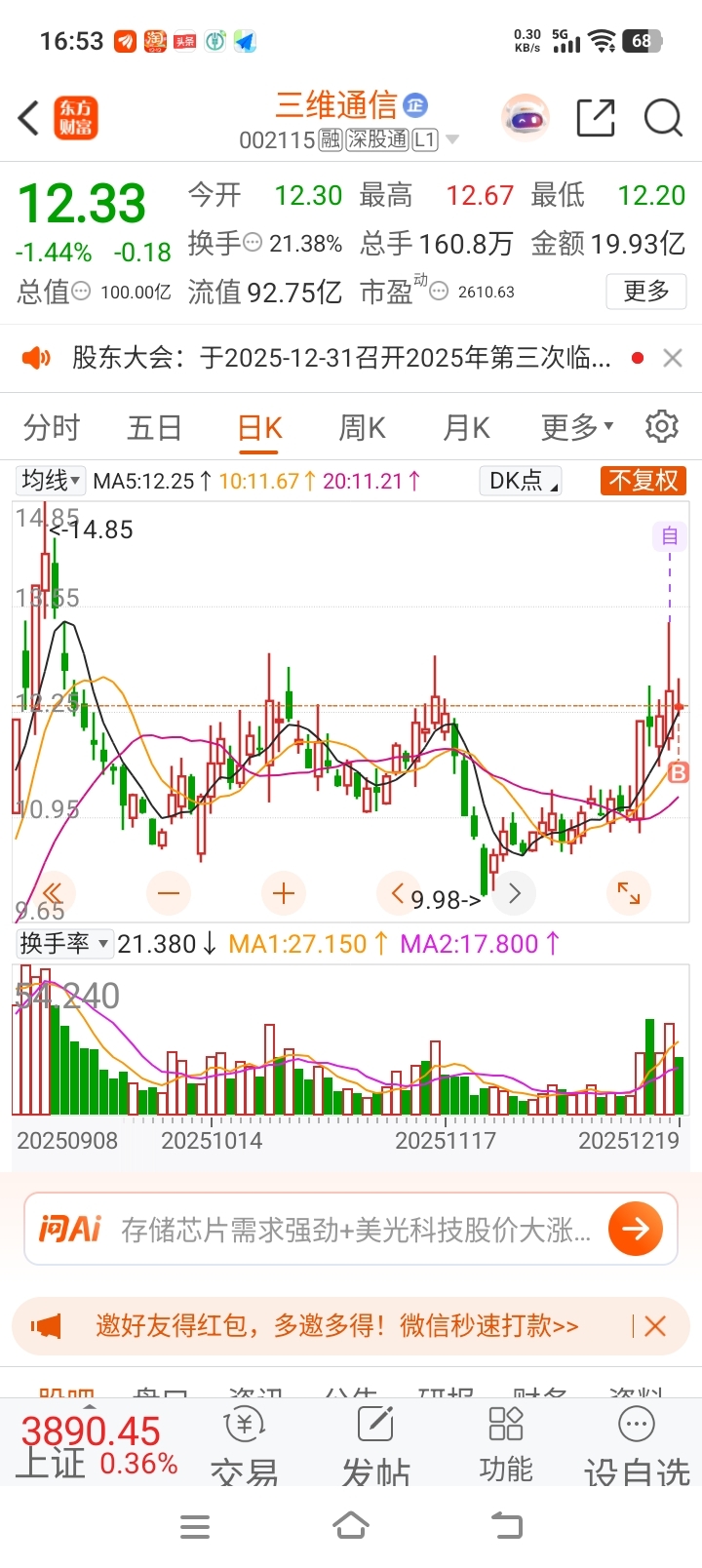 $三维通信(SZ002115)$ 看近几天日K走势,量价齐升,阳多阴少,且阳量逐渐放大,今日属正常调整,放心持股过周末!祝股友们下周能吃肉喝汤!
