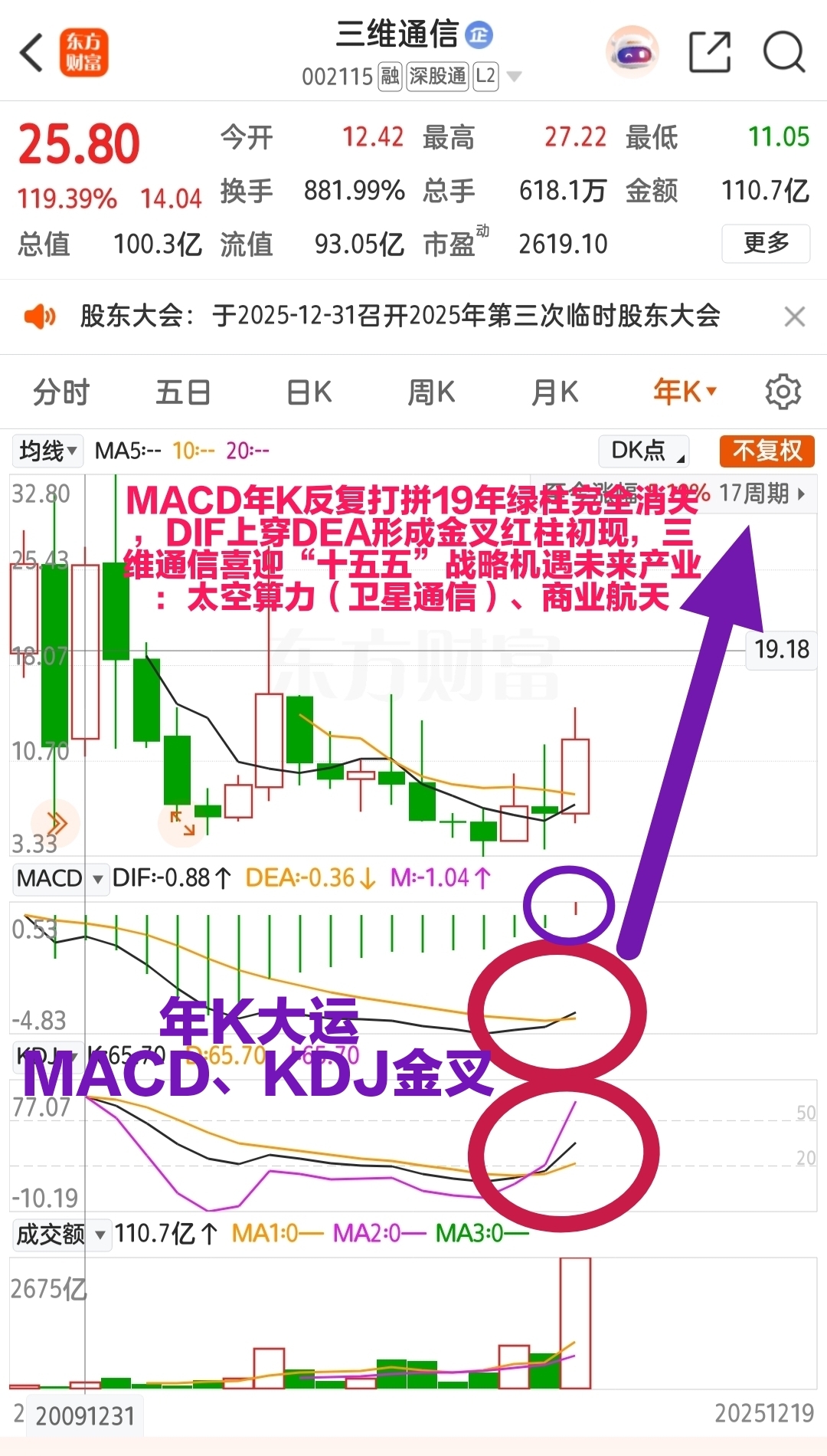 ,今早发图说2026年K大运MACD打拼19年才出现金叉,要飞到25.80元上方、KDJ金叉,成交额2800亿倍量交易,还说太空算力是未来产业,所以人家老板想起薜宝钗“好风频借力,送我上青云”就借十五五时代战略机遇准备减持一些了,都怪我