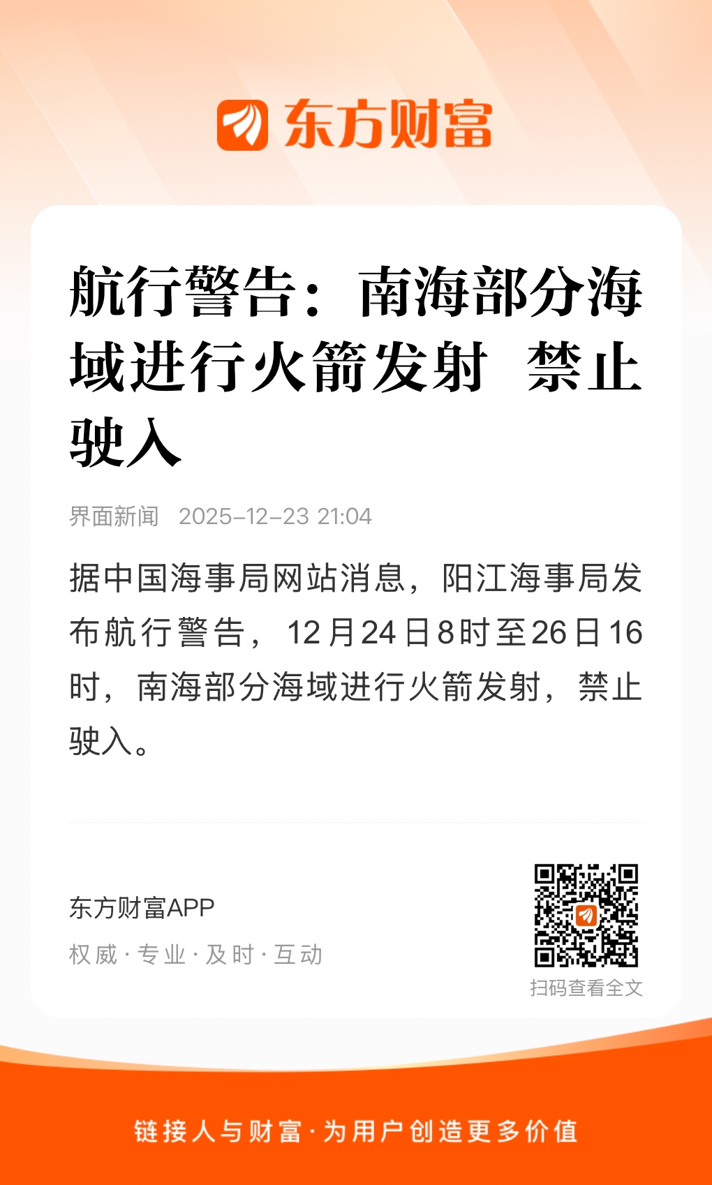 据中国海事局网站消息,阳江海事局发布航行警告,12月24日8时至26日16时,南海部分海域进行火箭发射,禁止驶入。