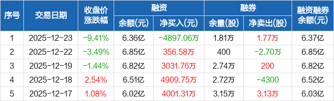 三维通信:融资净偿还4897.06万元,融资余额6.36亿元(12-23)