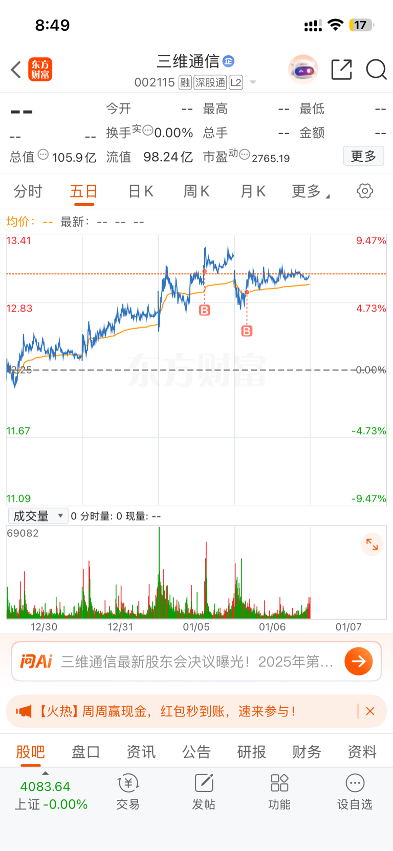 $三维通信(SZ002115)$ 加仓加仓,今天吃个涨停