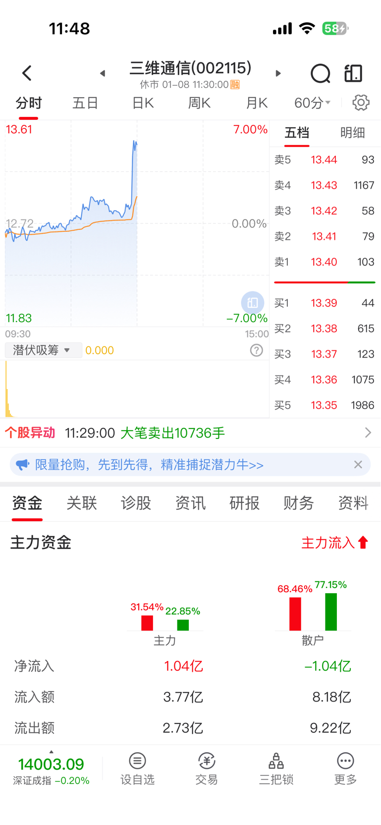 $三维通信(SZ002115)$ 上午资金情况