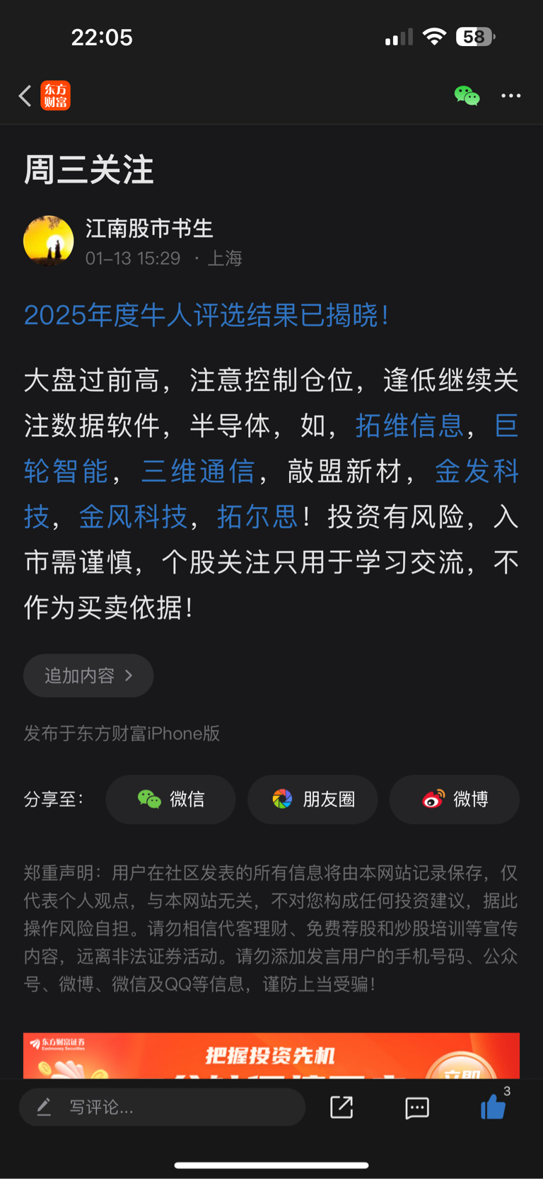 温馨提示: 1.根据《证券法》规定,禁止编造、传播虚假信息或者误导性信息,扰乱证券市场;2.用户在本社区发表的所有资料、言论等仅代表个人观点,与本网站立场无关,不对您构成任何投资建议。用户应基于自己的独立判断,自行决定证券投资并承担相应风险。《东方财富社区管理规定》