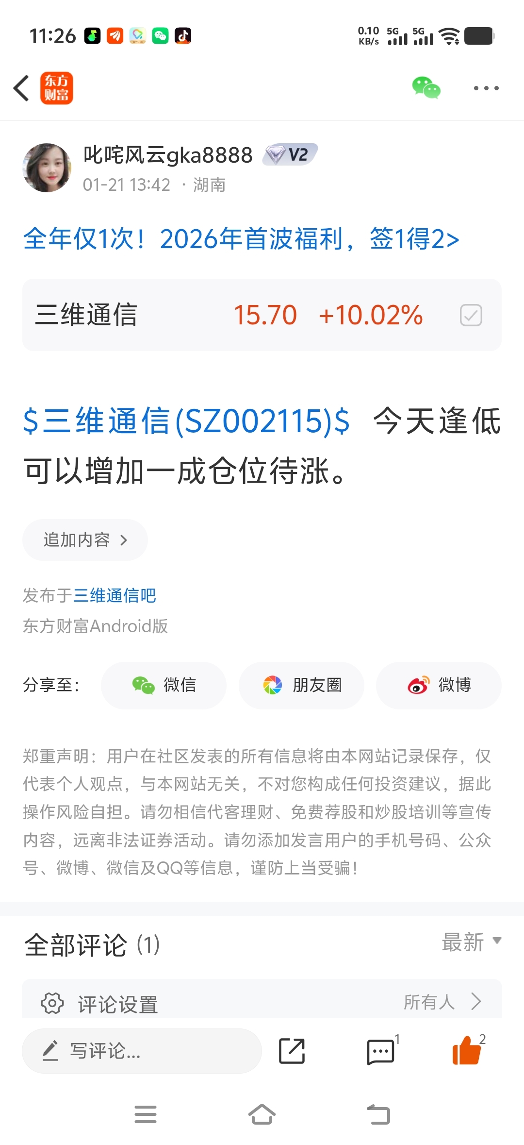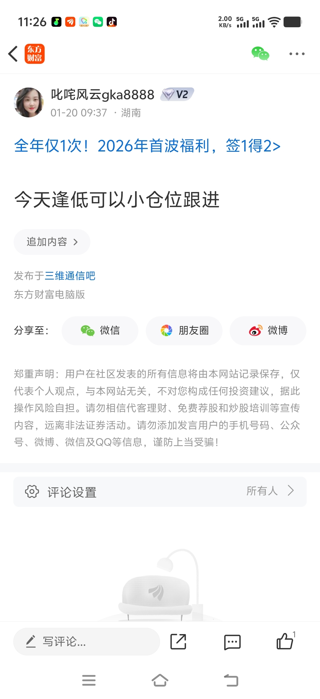 温馨提示: 1.根据《证券法》规定,禁止编造、传播虚假信息或者误导性信息,扰乱证券市场;2.用户在本社区发表的所有资料、言论等仅代表个人观点,与本网站立场无关,不对您构成任何投资建议。用户应基于自己的独立判断,自行决定证券投资并承担相应风险。《东方财富社区管理规定》