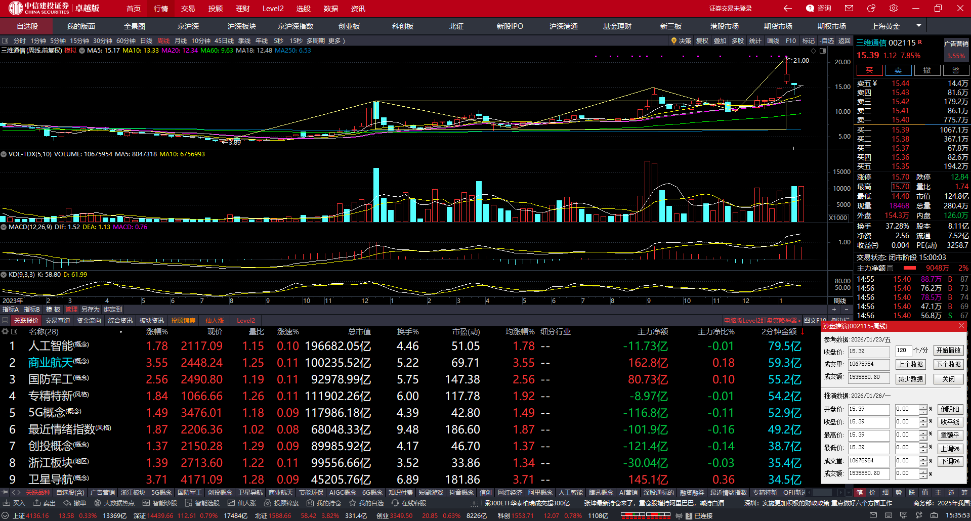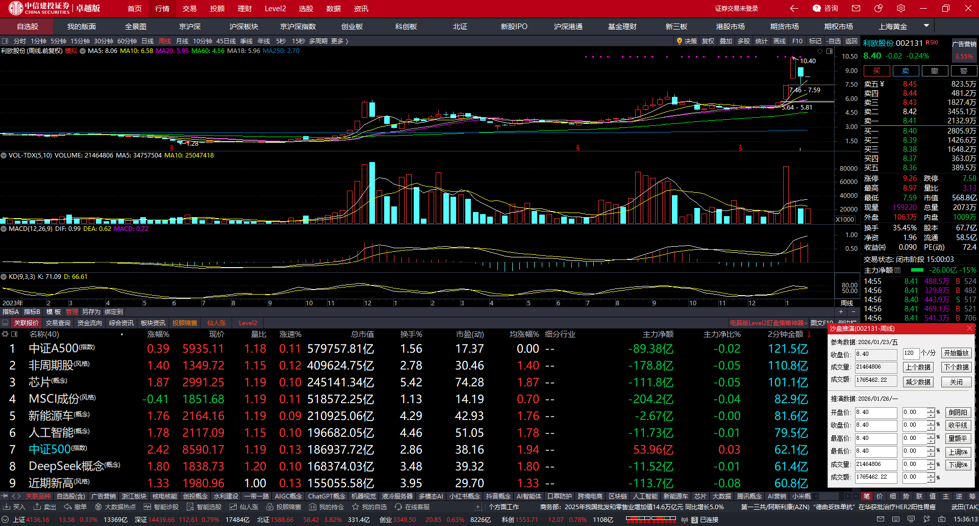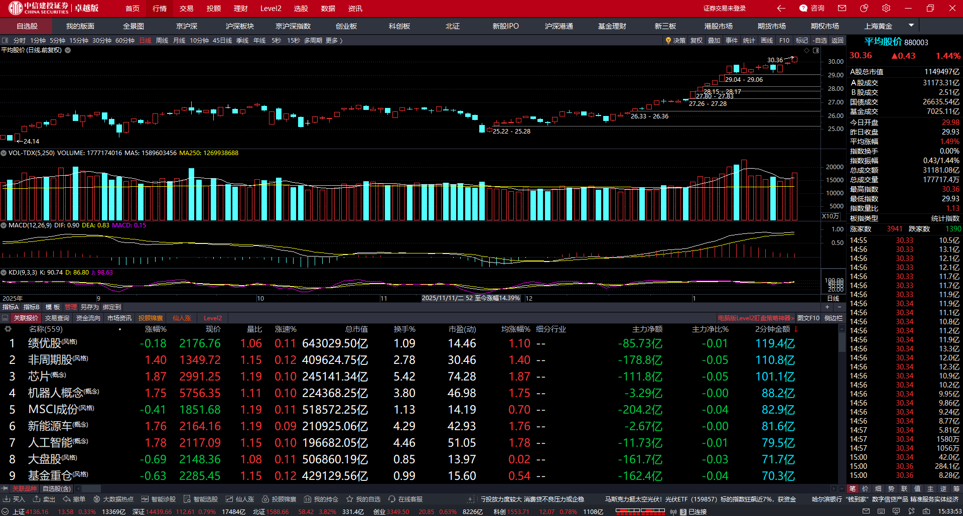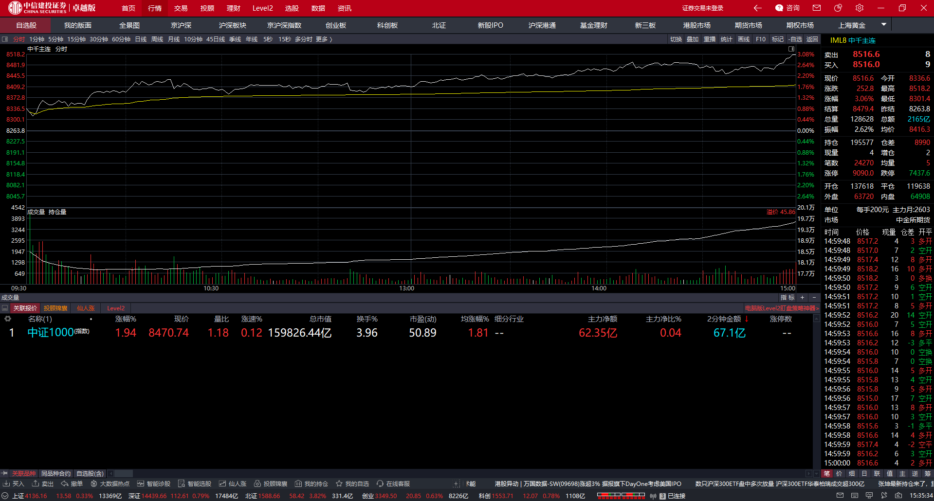 那么每天指数在横盘,但是个股都轮动普涨,证明主力在悄悄的调仓换股,如果你还没看懂当前的盘面节奏,那你接下来俩个月注定不好做。老登股现在是处于一个加速敢底的过程,而中证一千以及500的中小票,在打出60分钟顶背之后在进行一个冲顶的过程。那么如何分辨什么时候小大切换呢?只要指数还控制在4140之下,那就是中小盘的轮动天下,如果有哪一天指数在尾盘正式站上4140,那么可能以大权重为首的票可能就会带领指数最后走一波冲关补涨,然后大三浪结束。当然不排除鱼尾行情是大小票一起冲,不好说。到时候再结合盘面分析是否大小切换行情确立。那么今天航天又是放量普涨,所以整体整个市场的赚钱效应是很不错的,在同一轮动周期当中还有化工,以及电网设备。你们手里的航天标,涨多了可以切到回踩五日的化工或者电网设备,灵活切换,才能再这个市场控制好回撤。那么对于下周一的预期,还是一个轮动普涨,等什么时候老登股止跌见底的时候。可能小大切换就开始了。