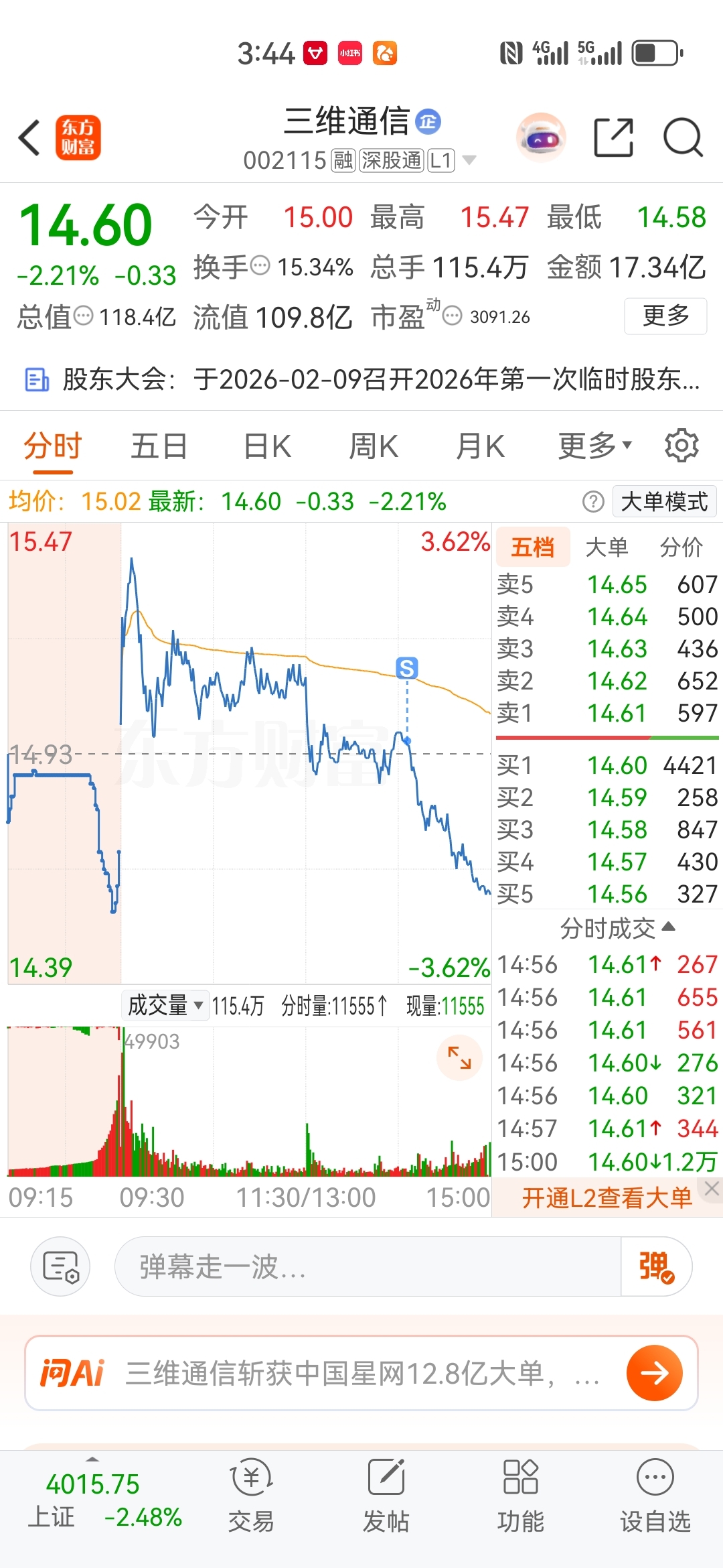 $三维通信(SZ002115)$ 我错了,我的原因