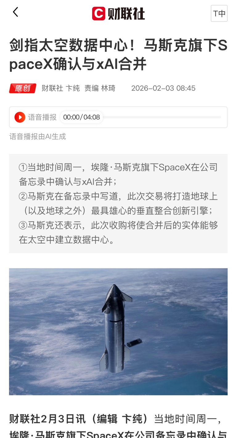 剑指太空数据中心!马斯克旗下SpaceX确认与xAI合并