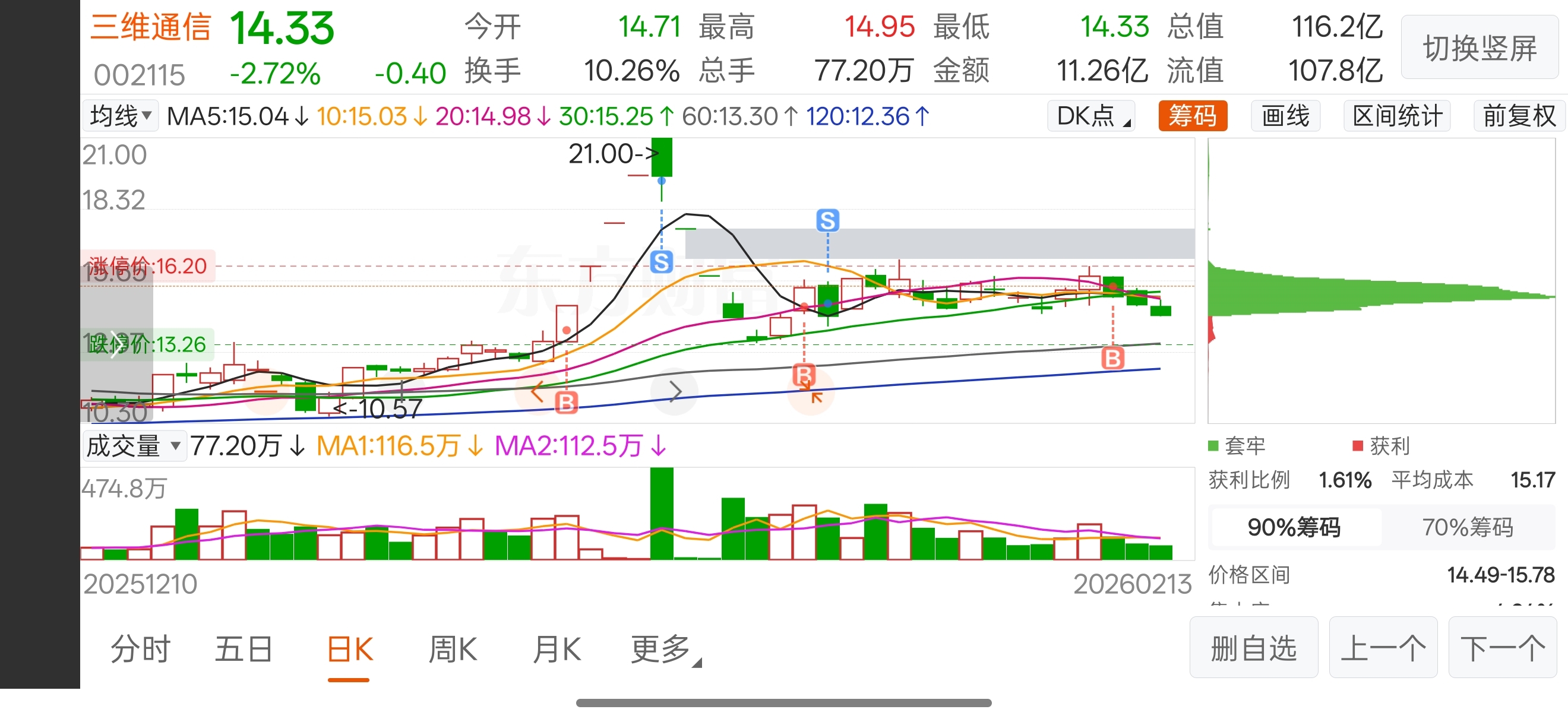 $三维通信(SZ002115)$ 这种筹码峰,是不是没有主力没有庄了?
