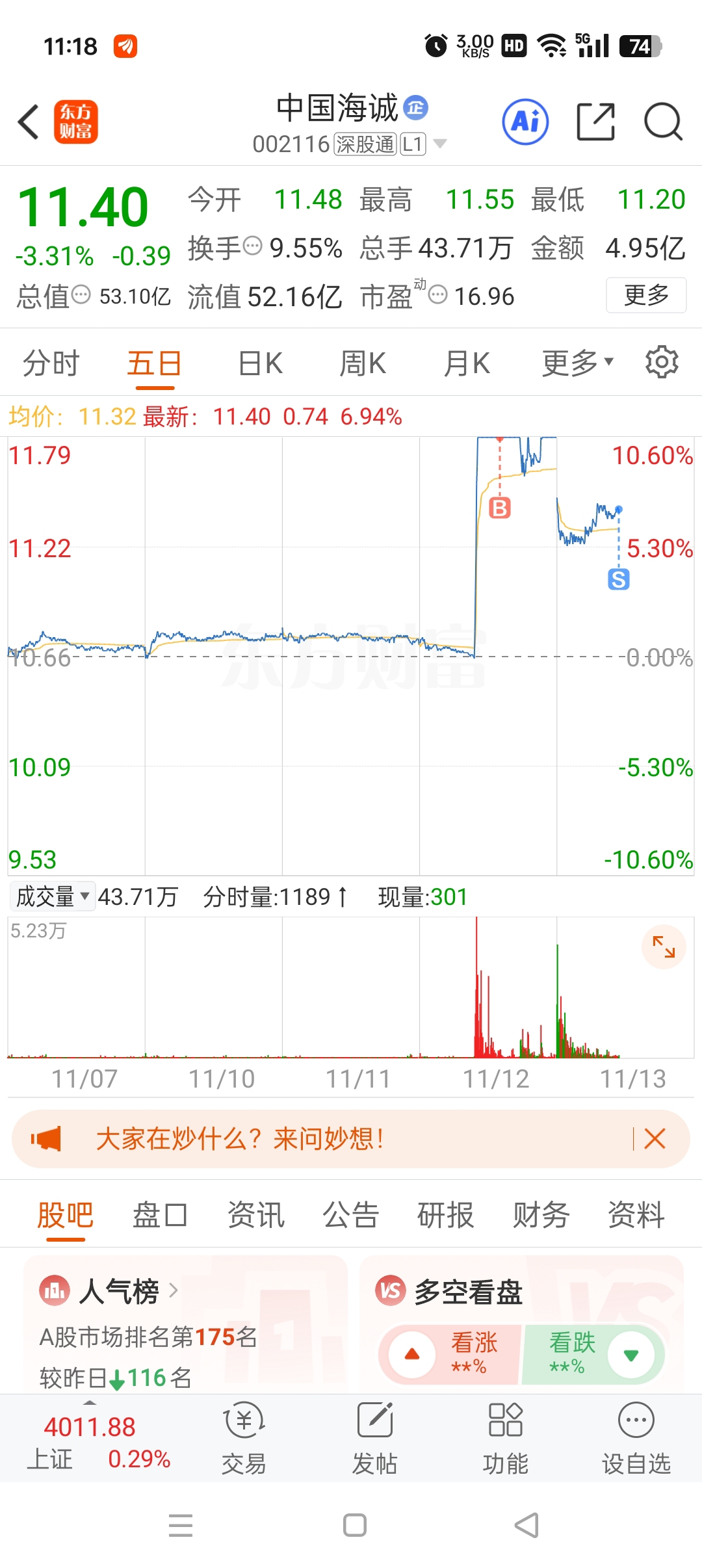 $中国海诚(SZ002116)$ 打板客的,进了久的掉肉。亏3.5%,清仓。幸好只买1.2w,不然亏死。