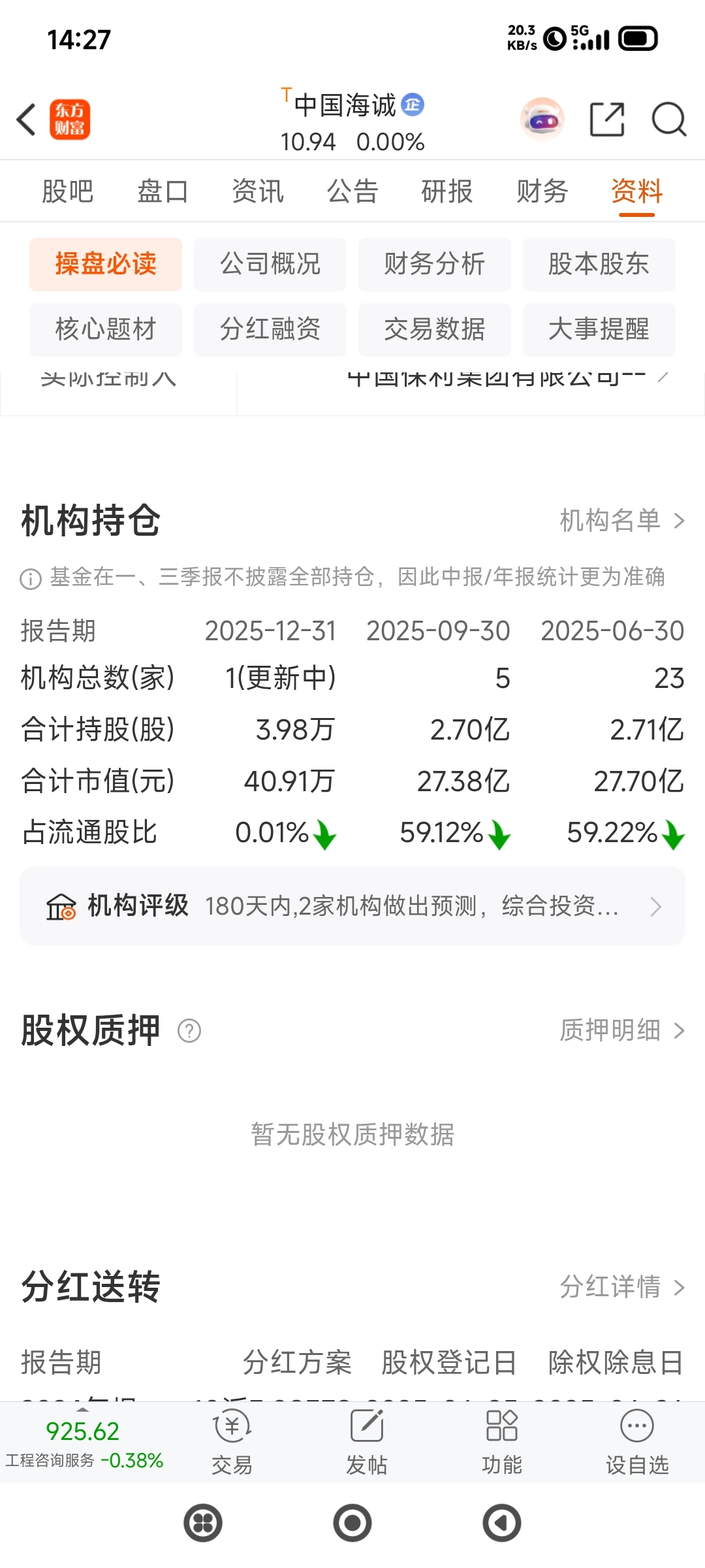$中国海诚(SZ002116)$ 机构持仓40万,全被散户买了
