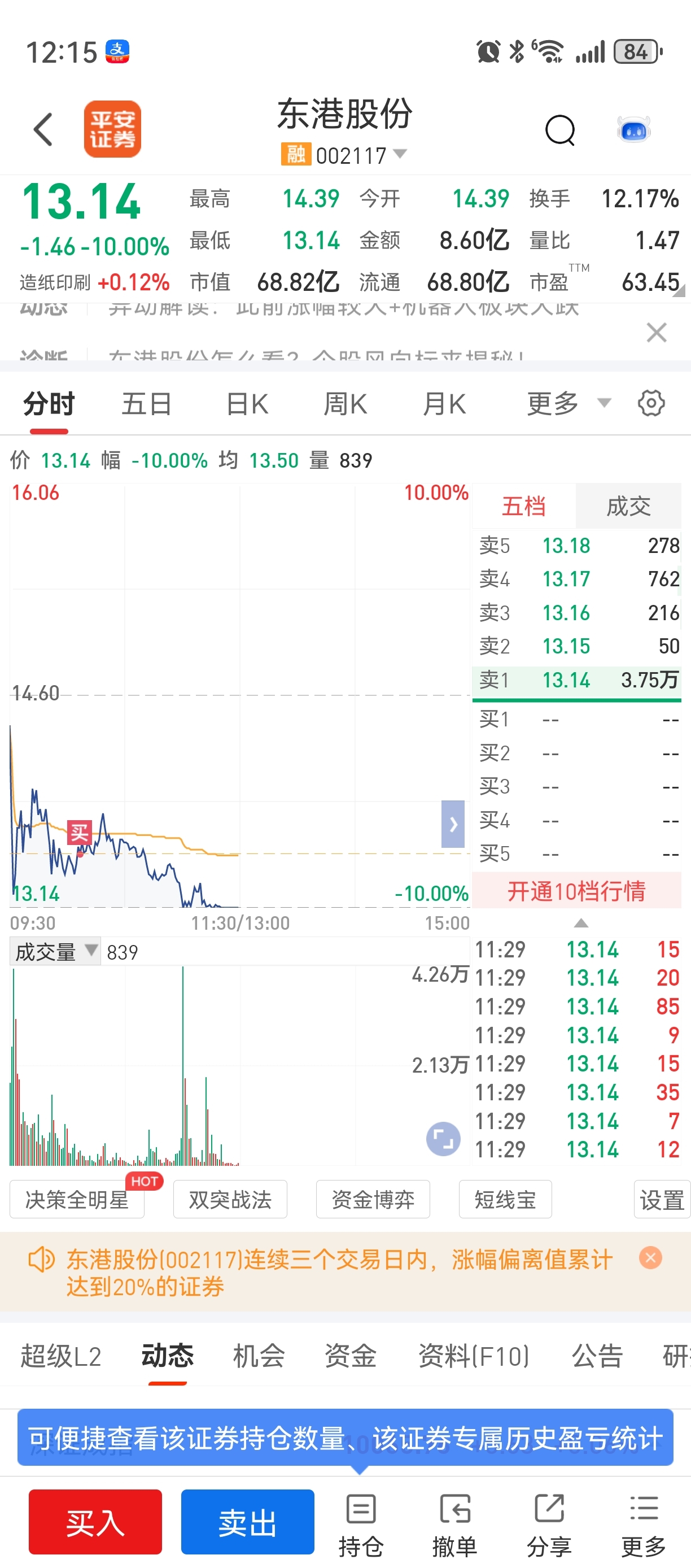 $东港股份(SZ002117)$ 今天水下抄了一点 看看他这人气冲得多快 下午必开板的