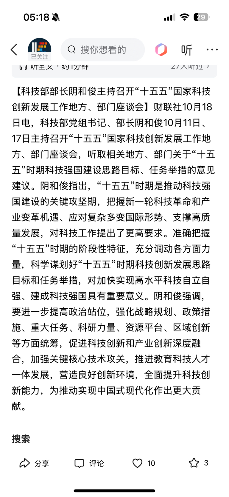 $东港股份(SZ002117)$ 科技部部长阴和俊主持召开“十五五”国家科技创新发展工作地方、部门座谈会