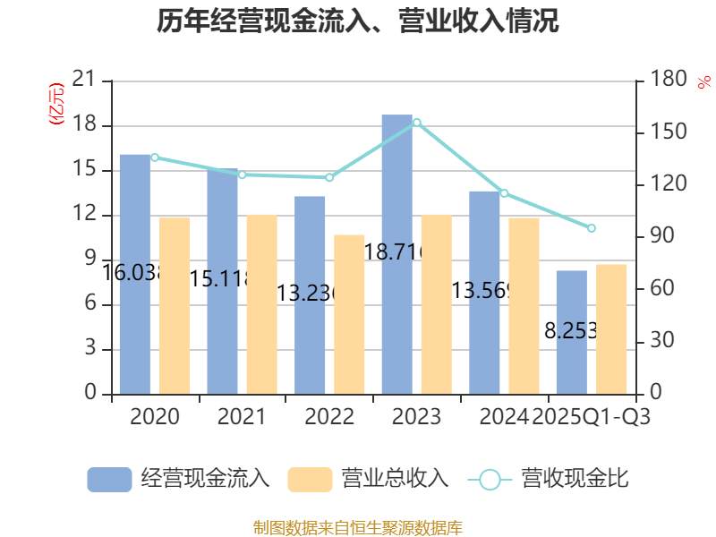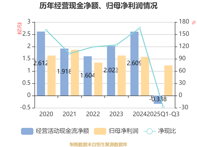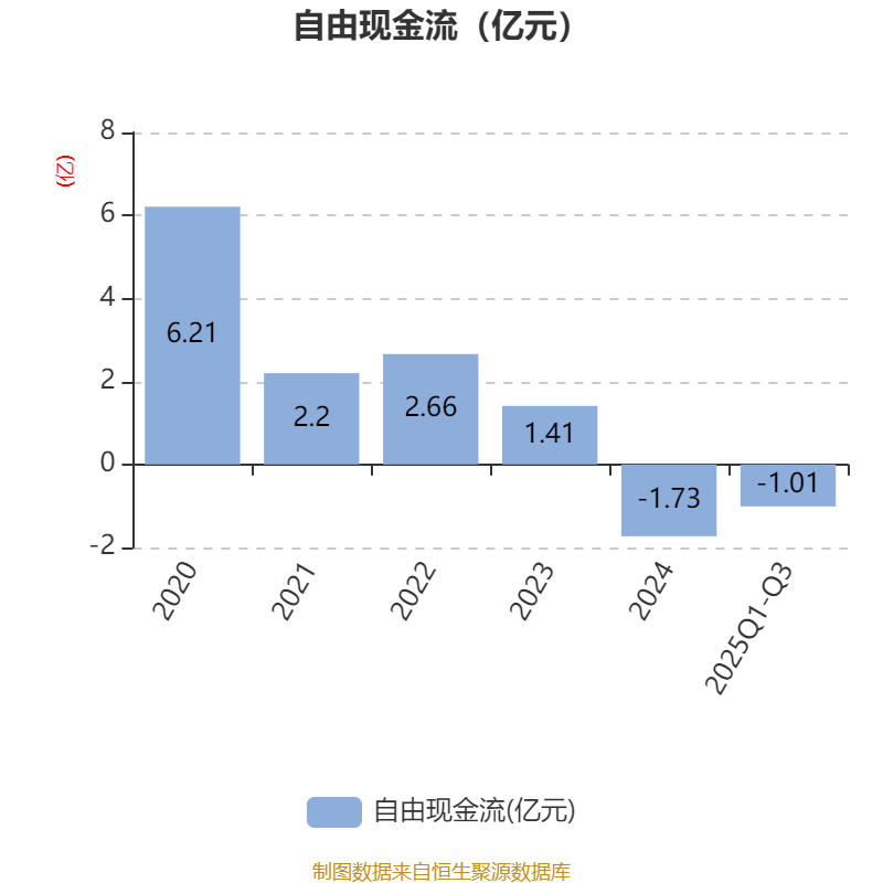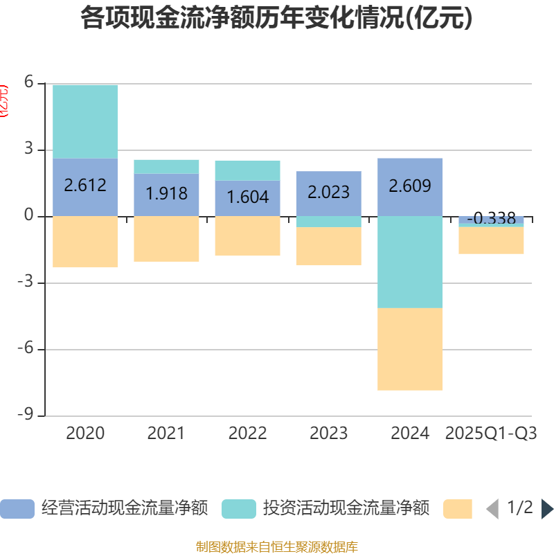 2025年前三季度,公司经营活动现金流净额为-3377.79万元,同比增加362.63万元;筹资活动现金流净额-1.22亿元,同比增加1.73亿元;投资活动现金流净额-1563.67万元,上年同期为-3.92亿元。