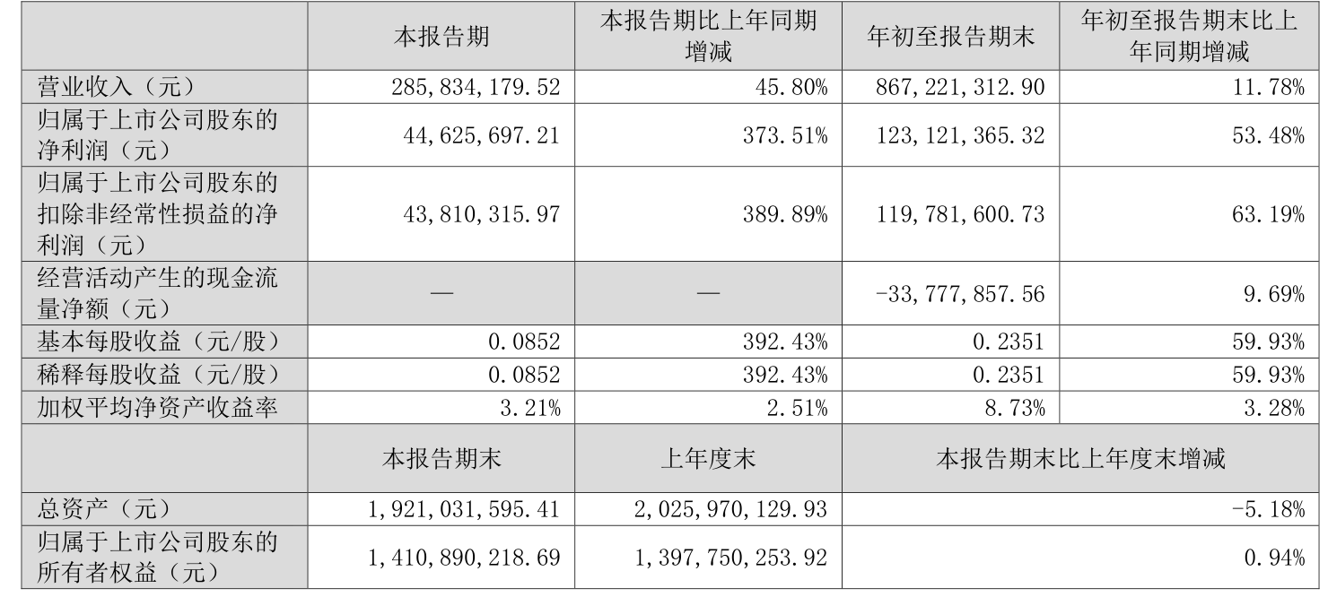 中证智能财讯东港股份(002117)10月25日披露2025年第三季度报告。前三季度公司实现营业总收入8.67亿元,同比增长11.78%;归母净利润1.23亿元,同比增长53.48%;扣非净利润1.2亿元,同比增长63.19%;经营活动产生的现金流量净额为-3377.79万元,上年同期为-3740.41万元;报告期内,东港股份基本每股收益为0.2351元,加权平均净资产收益率为8.73%。