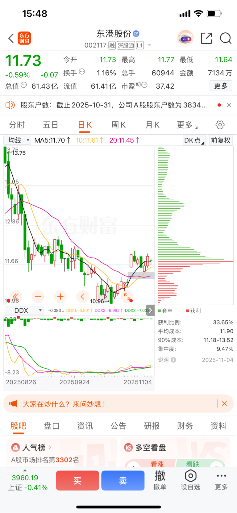 看下筹码峰 散户一直在买 机构在出 要想东港涨 散户就别买了 让他卖不出去才会拉