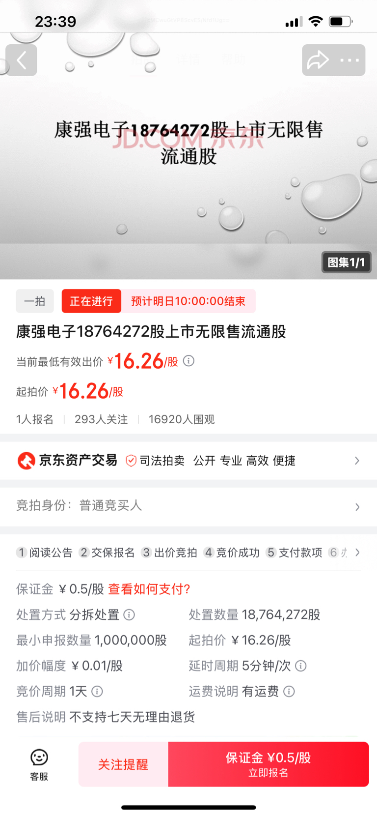 $康强电子(SZ002119)$ 上午十点结束拍卖