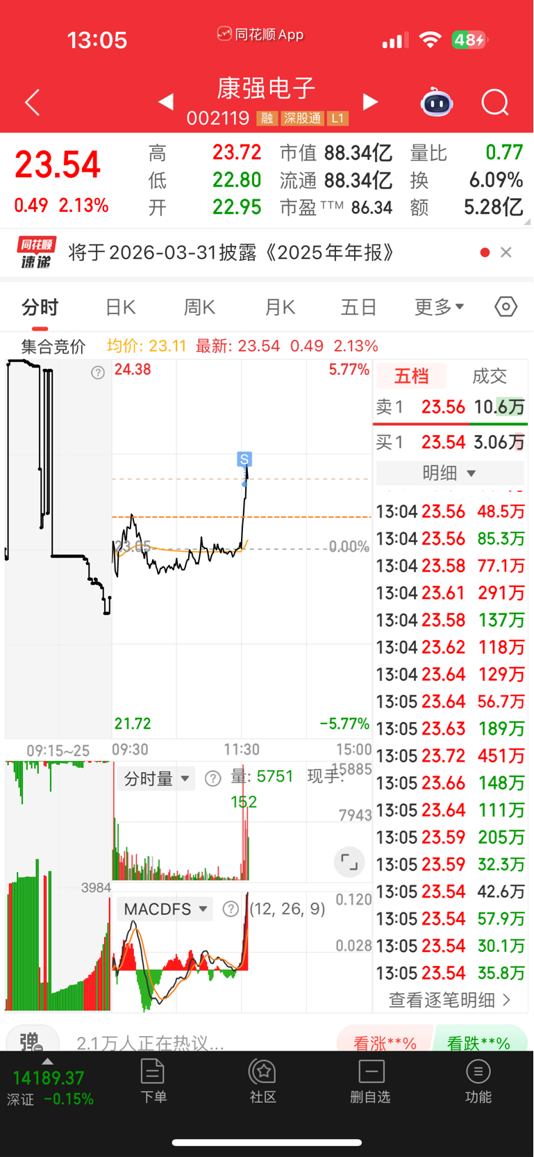 $康强电子(SZ002119)$ 23.5走了 赚了0.9个点 500块