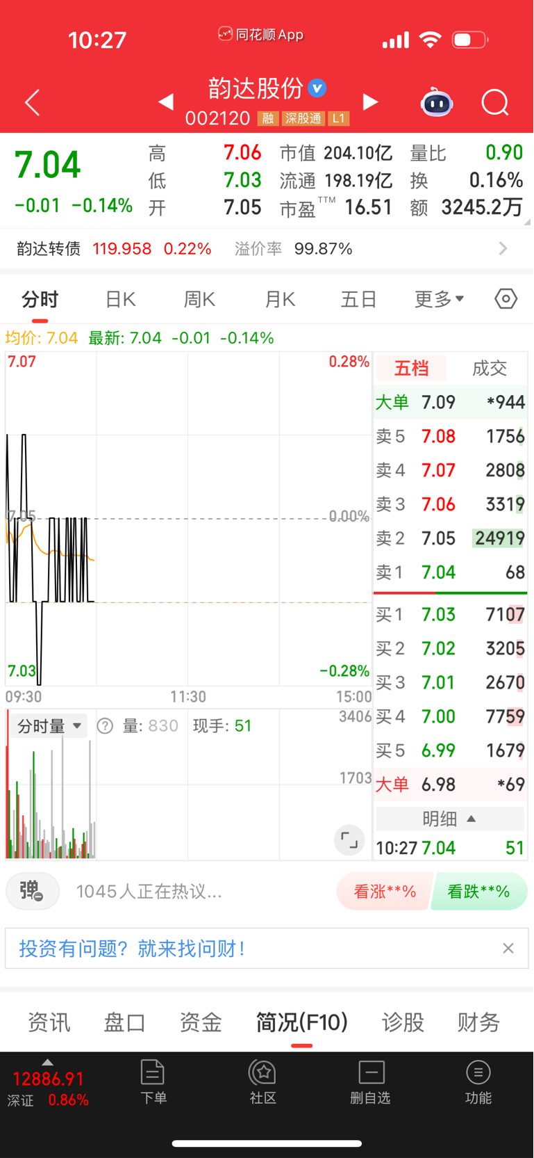 $韵达股份(SZ002120)$ 25000手压着吓我们,太狠了