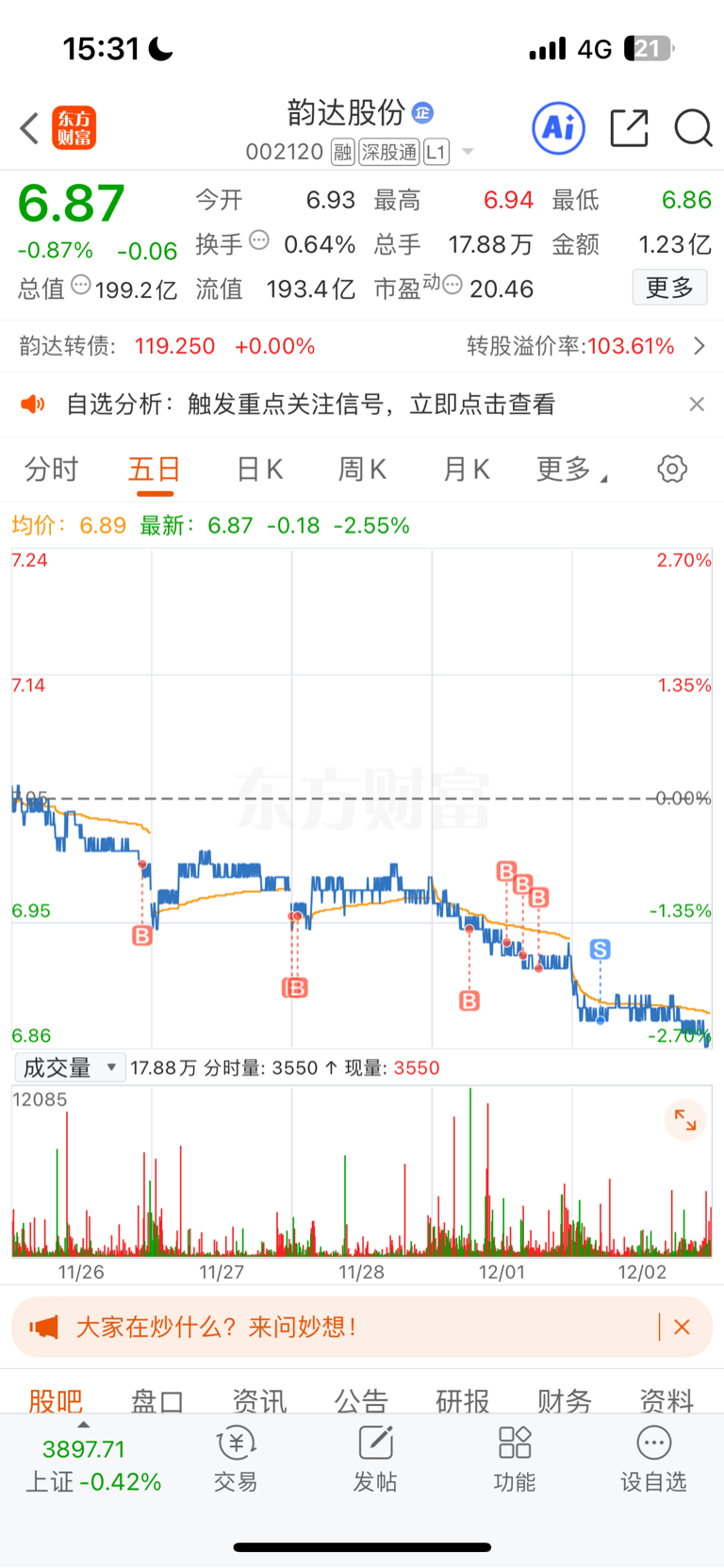 $韵达股份(SZ002120)$ 扛不住了,先减出去一半……他大爷的。