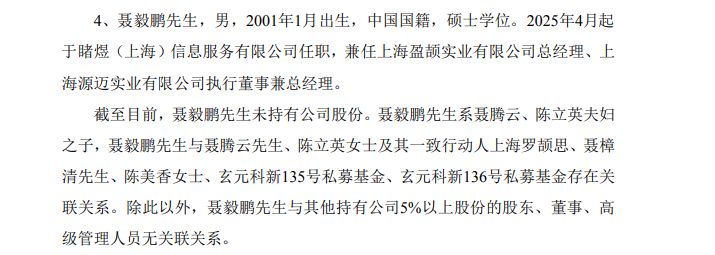 公告称,聂毅鹏拥有硕士学位;其自2025年4月起于睹煜(上海)信息服务有限公司(下称“睹煜信息”)任职,兼任上海盈颉实业有限公司(下称“上海盈颉”)总经理、上海源迈实业有限公司(下称“上海源迈”)执行董事兼总经理。