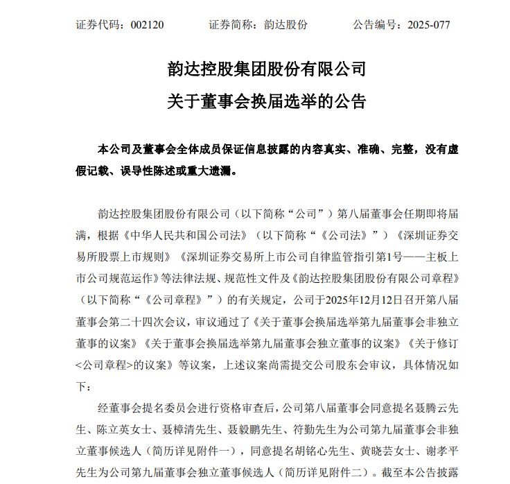 12月13日,韵达股份(SZ002120)发布关于董事会换届选举的公告。