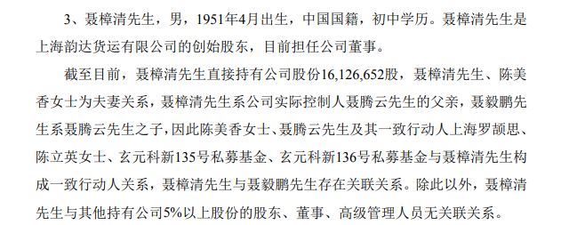 韵达股份表示,截至目前,聂毅鹏未持有公司股票。聂毅鹏与聂腾云、陈立英及其一致行动人上海罗颉思、聂樟清、陈美香、玄元科新135号私募基金、玄元科新136号私募基金存在关联关系。