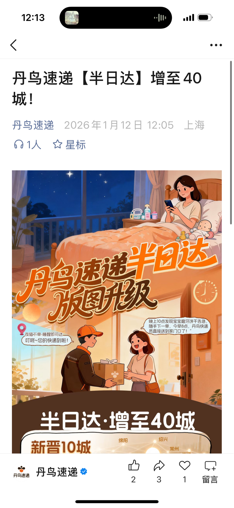 $韵达股份(SZ002120)$ 丹鸟速递半日达已增到40城,韵达你要加油啊,牛市还在走熊市的路