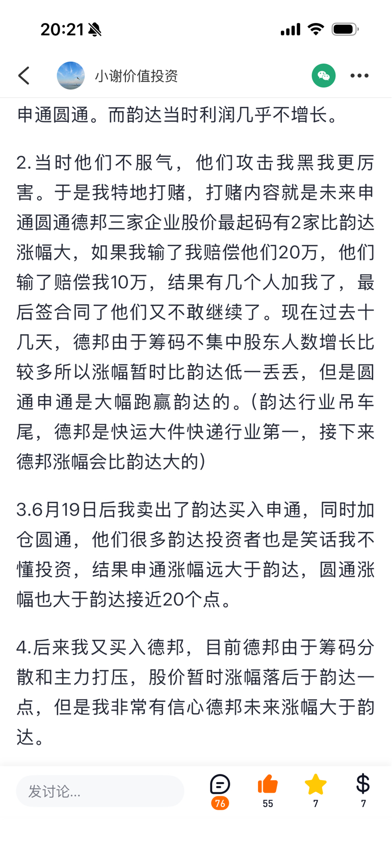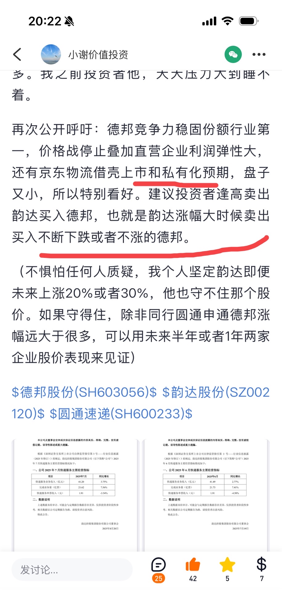 我每次赚到钱,他们就说运气!他们始终不服气!1.投资德邦的时候我就说了有私有化和借壳预期,现在发生了我赚钱了,你又眼红说运气。2.上半年韵达业务量比申通高的时候,我通过调研几个月后我一直说韵达溢价低,业务量比申通少,未来很挨打。你看看最近几个月数据是不是验证了?申通反超韵达业务量营收,而且差距扩大。收件价格申通也比韵达高。这也是运气吗?3.我现在根据韵达目前的月报数据,业务量下降7.37%营收负增长,这个基数比上半年还低。我提前预判他2026年业务量会很难看,也就是增长数据很差。你不信你届时再看!4.韵达股价8.7元的时候,我就说了韵达竞争力太差了,他的股价即便继续上涨20%他也守不住跌回来。所以我建议大家买14元的德邦。现在来验证,韵达有在8.7元继续上涨20%?韵达有守住股价吗?你如果那时候听我的14元买德邦,你现在是不是有30个点收益。我每次提前预判是不是都对了?在你眼里是运气,其实背后你不知道别人跟踪和调研以及思考花了多少时间。我上半年,当韵达业务量还比申通高的时候,我就大量调查了几百个驿站几百个网点,不仅是线下,我还加了全国各地快递员的联系方式,包括网点负责人,还加了很多快递行业的群。你以为花的心血少吗?还有大量的思考,也很费脑力的!可是当我把我的调研免费无偿公开的时候,很多韵达的投资者阴谋论,集体攻击我说我卖了唱空!我当时就说了:如果韵达真的好,我为啥要卖呢?那肯定是不看好或者有更好的才会卖了韵达买别的。我今天并非是说韵达高估,我表达的意思是我觉得申通更好,在直接一点韵达也不高估,只是我觉得申通弹性更大收益更大,然后基本面更加让人心安,更加稳!韵达的话容易出事,他网络不稳定,基本面也不断下坡路。申通还背靠阿里和菜鸟,你们不要小看阿里,你记住这句话就对了!有阿里在,你不用看什么负债和现金,不用有一丁点慌,只要申通基本面稳固,业务量增长,品牌客户多,网络稳定,然后竞争力和溢价不断提升,就行了!这些才是最重要的!(目前韵达和极兔收件价格基本一致,申通已经比他们收件价格高5分左右,这个就是核心竞争力和溢价)$韵达股份(SZ002120)$ $德邦股份(SH603056)$$申通快递(SZ002468)$