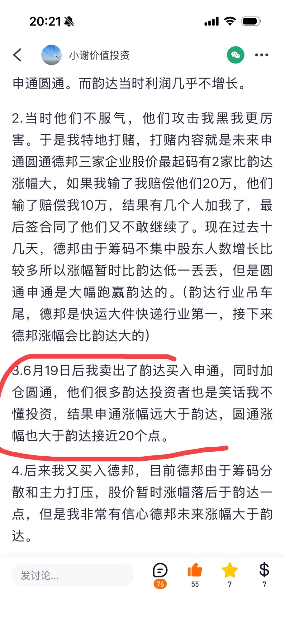1.第一次是619日,我卖出韵达买入10元多的申通和12元多的圆通,你们一大推人攻击我是韭菜,还和我打赌说韵达接下来涨幅比申通圆通大,结果短短三个月申通圆通涨幅80%以上甚至接近翻倍,韵达呢涨幅最大只有30%。这一次你们完败!