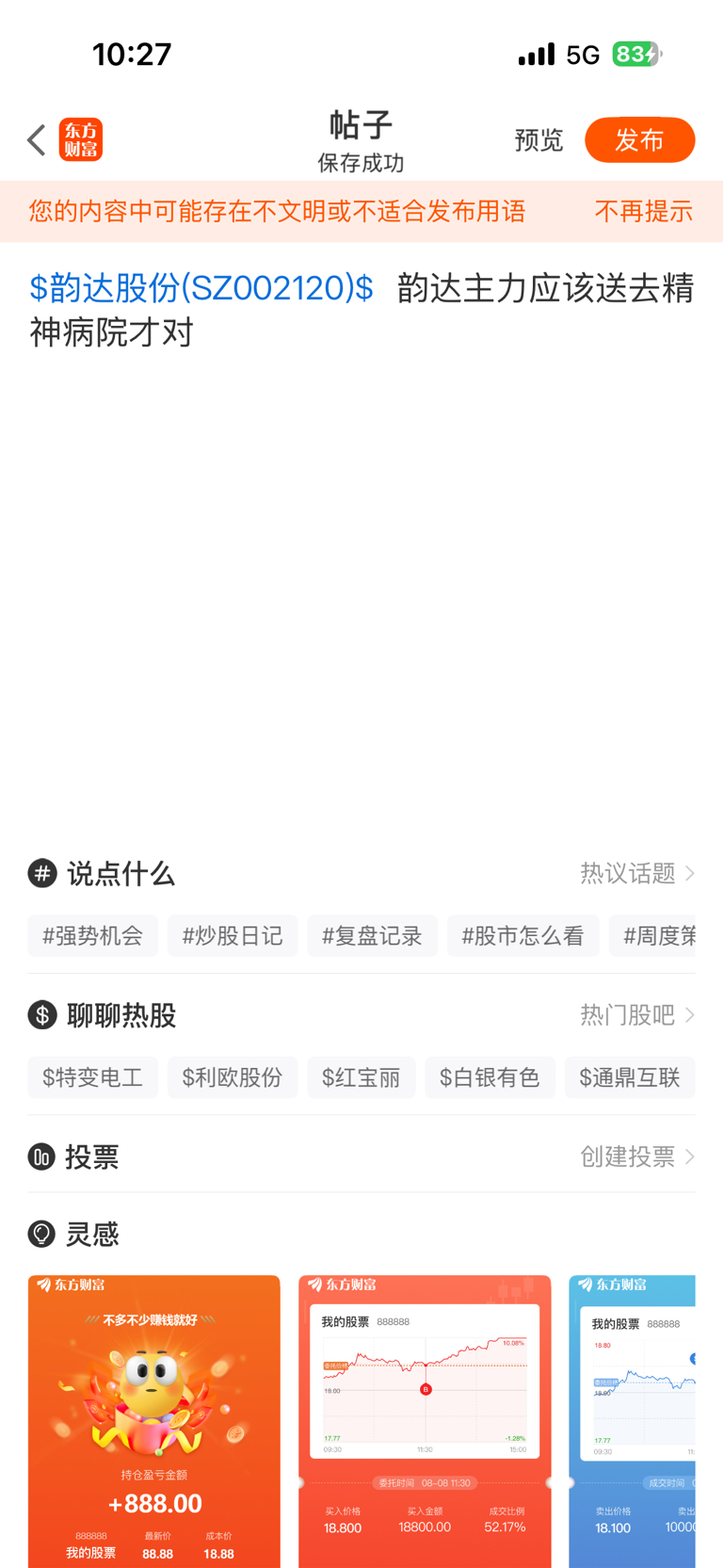 温馨提示: 1.根据《证券法》规定,禁止编造、传播虚假信息或者误导性信息,扰乱证券市场;2.用户在本社区发表的所有资料、言论等仅代表个人观点,与本网站立场无关,不对您构成任何投资建议。用户应基于自己的独立判断,自行决定证券投资并承担相应风险。《东方财富社区管理规定》