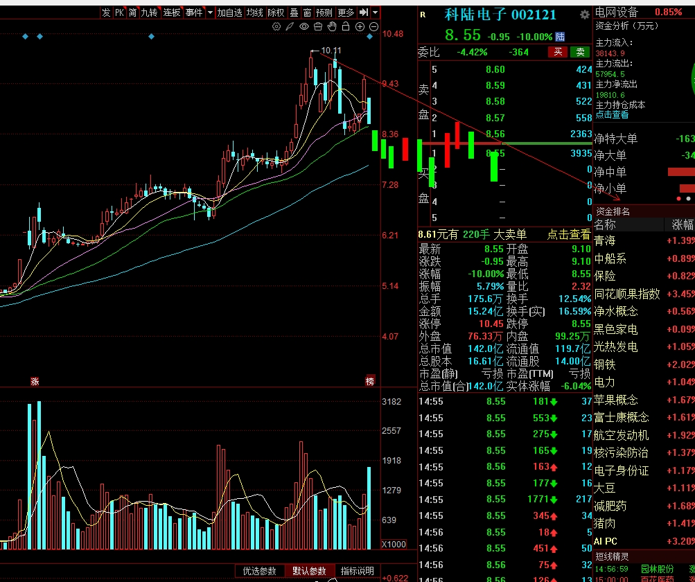 $科陆电子(SZ002121)$ 竞价一看低开5个点,在看阳光高开近3个点,在看大盘高开,沃尼妹这跟A杀有什么区别,连滚带爬出了,今天的利润全被这小子带走了,溜了,后面K线帮你们画好了