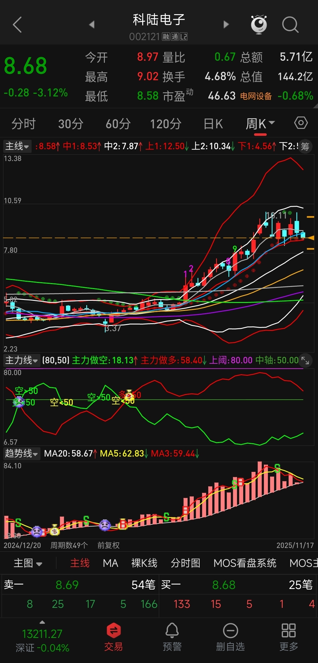 趋势已断。日线收口,主力线死叉,趋势线抵抗失败加速下行。周线收口,主力做多线、趋