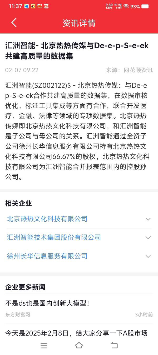 $汇洲智能(SZ002122)$ 从同花顺看到的