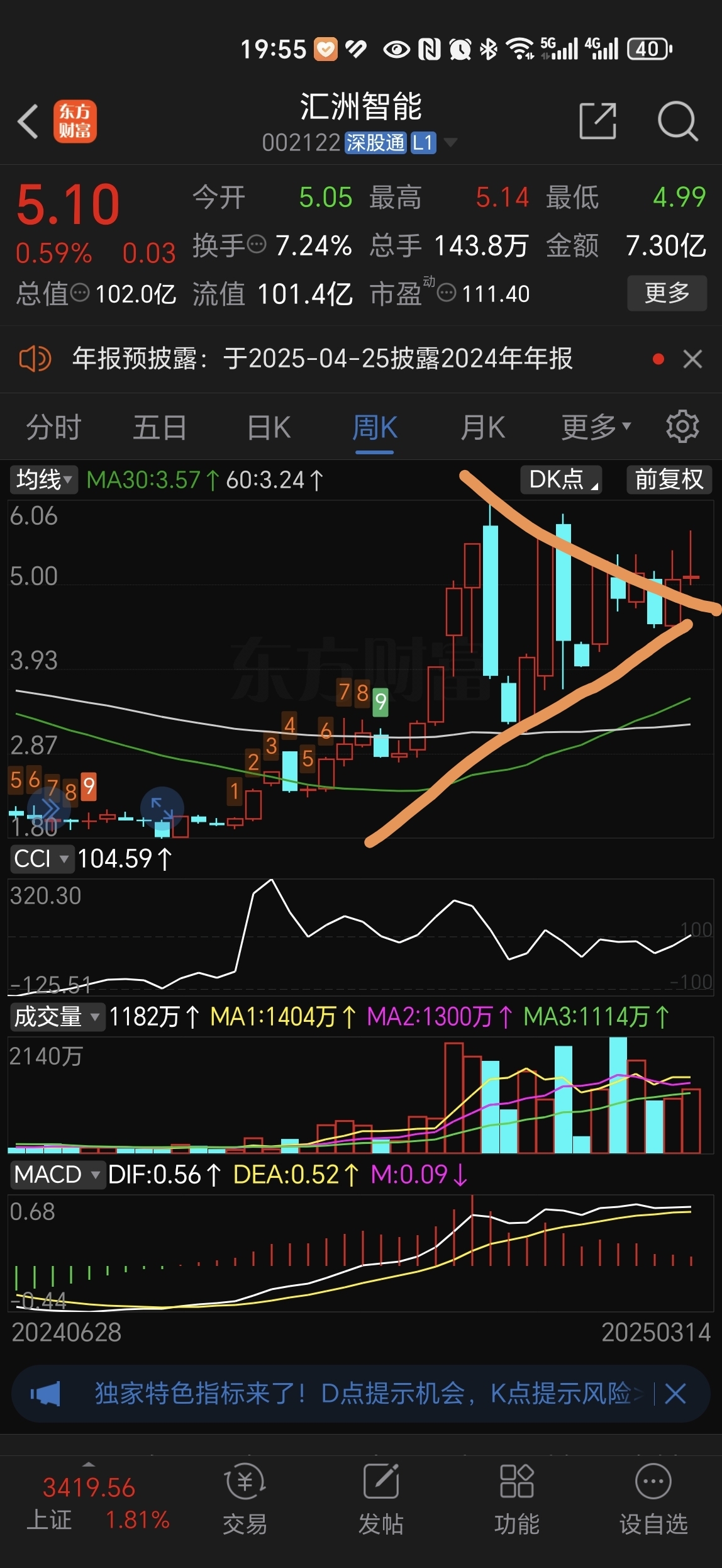 周线看,收敛三角形选择了方向,下周得吃掉上影线。