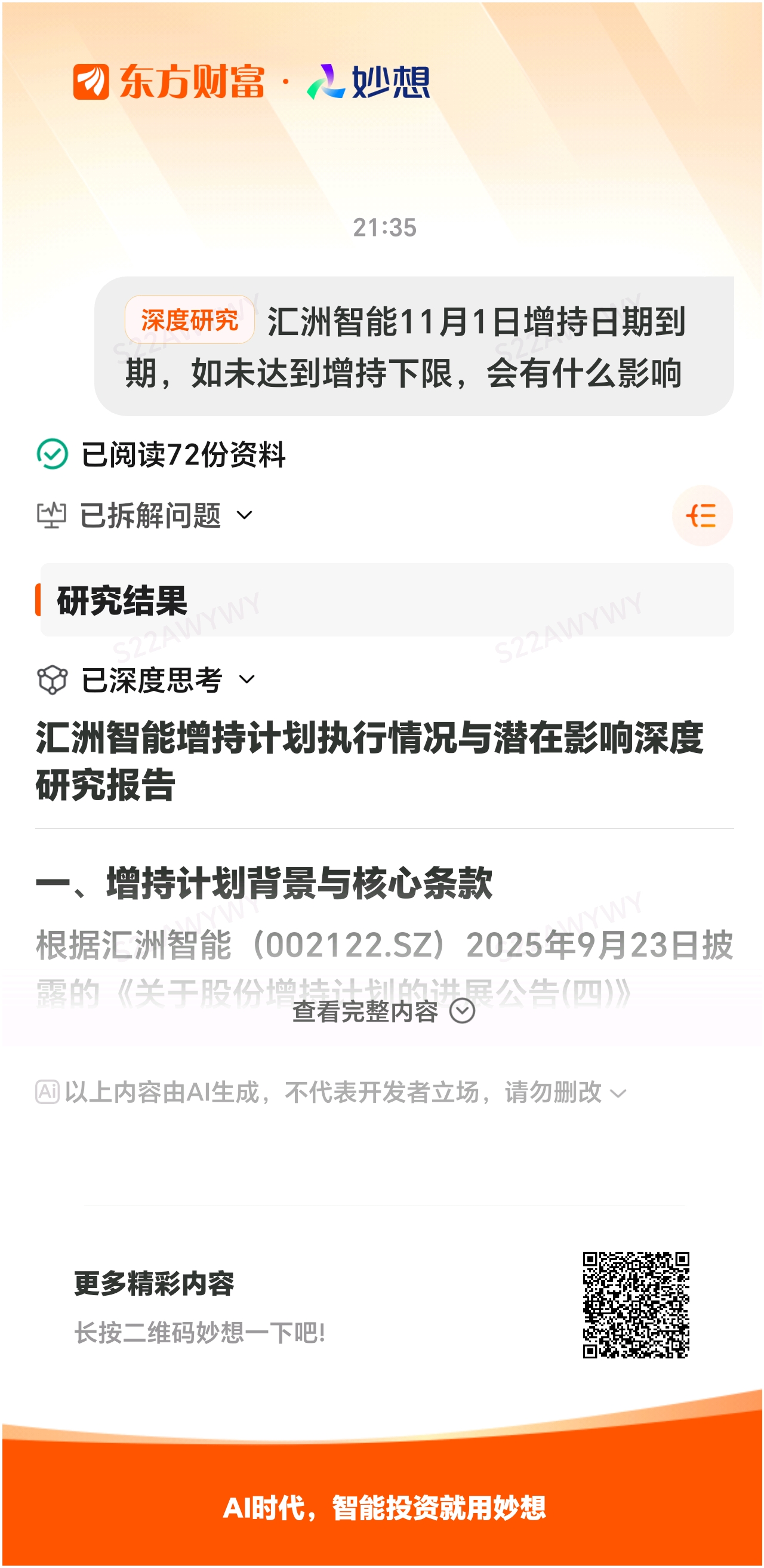 #@妙想,你怎么看?# 妙想一下:汇洲智能11月1日增持日期到期,如未达到增持下限,会有什么影响