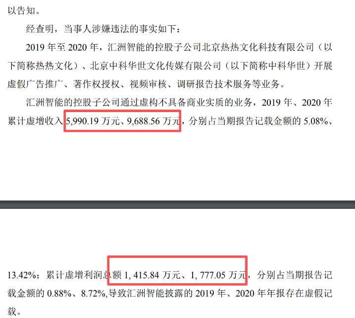 汇洲智能的控股子公司通过虚构不具备商业实质的业务,2019年、2020年累计虚增收入5990.19万元、9688.56万元,分别占当期报告记载金额的5.08%、13.42%;累计虚增利润总额1415.84万元、1777.05万元,分别占当期报告记载金额的0.88%、8.72%,导致汇洲智能披露的2019年、2020年年报存在虚假记载。