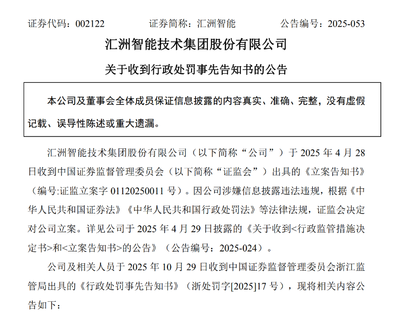 10月29日晚,汇洲智能(002122)发布公告称,公司及相关人员于当日收到浙江证监局出具的《行政处罚事先告知书》,公司涉嫌信息披露违法违规一案已调查完毕,浙江证监局依法拟对公司及相关人员作出行政处罚。