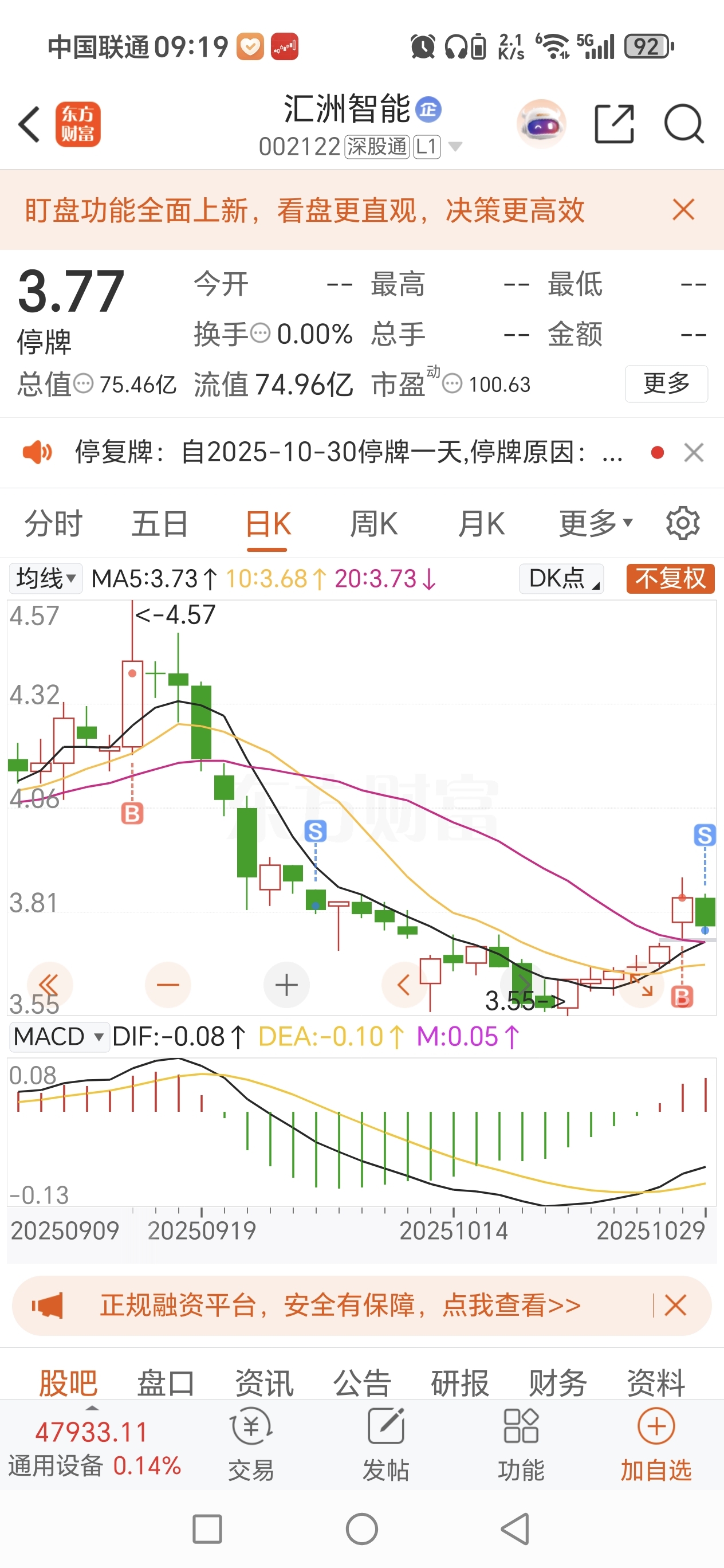 $汇洲智能(SZ002122)$ 前天进去,昨天亏两个点直接跑了
