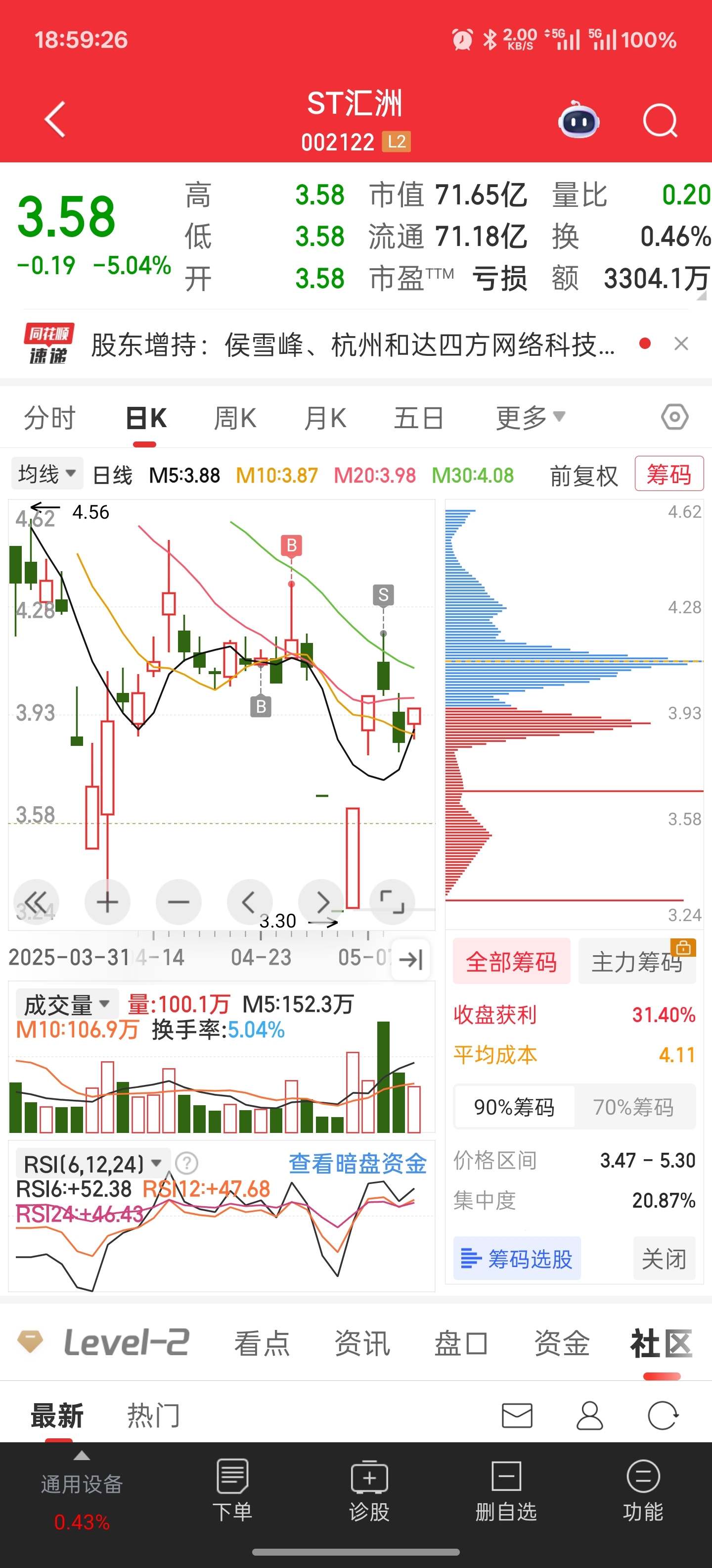 $ST汇洲(SZ002122)$ 不要心存侥幸,能走的赶紧走,和四月份汇洲智能一样,财务记错了。当时公告出来吃了两个地板,因为我只有10000块的,当时无所谓,仓位小,当打水漂了。后来拉了两个涨停板,亏一两百块钱,直接清仓走人,结果上周五ST了,这种连最基本底线都没有的公司,不要抱有任何幻想