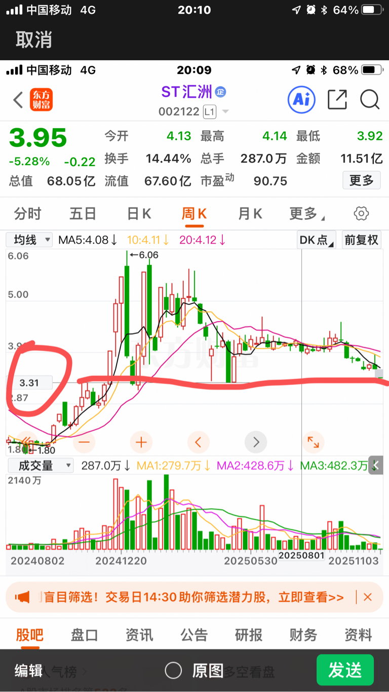 $ST汇洲(SZ002122)$ 明天打开跌停板 别问我怎么知道的!看看下图强支撑位 一目了然