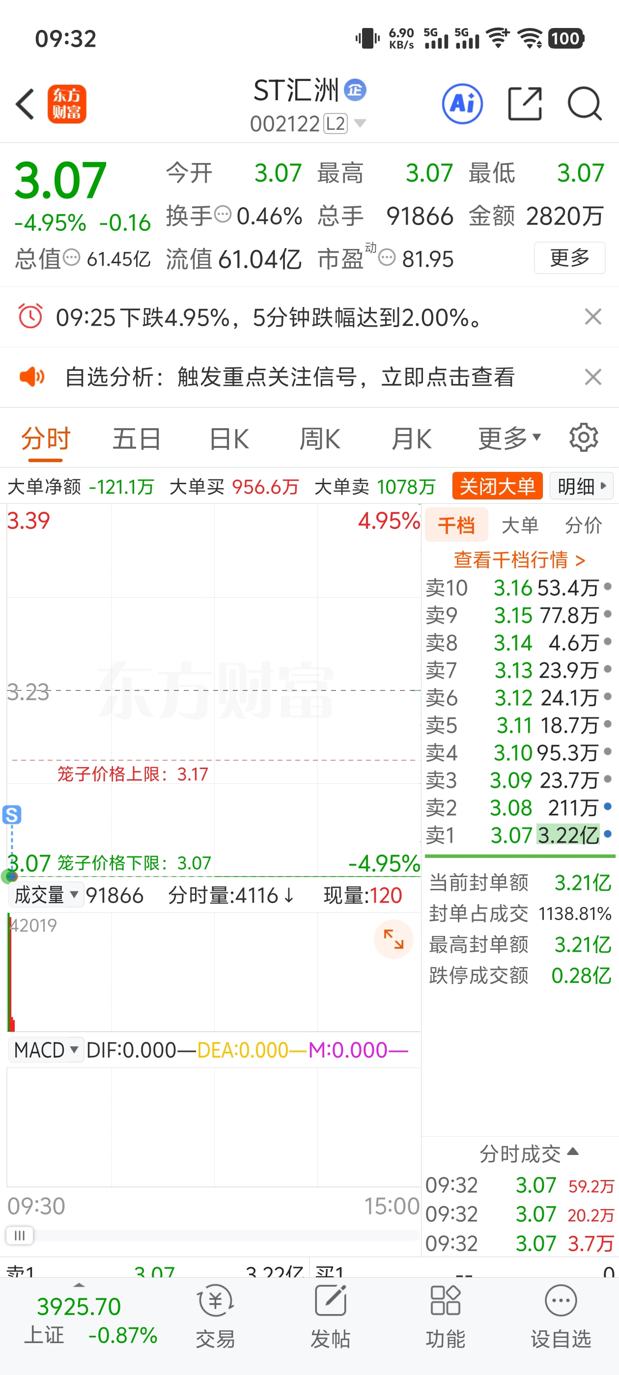 $ST汇洲(SZ002122)$ 开板了,亏25厘米终于跑了,虽然我知道卖的不对,但也没办法,走了,有机会2元我再买点