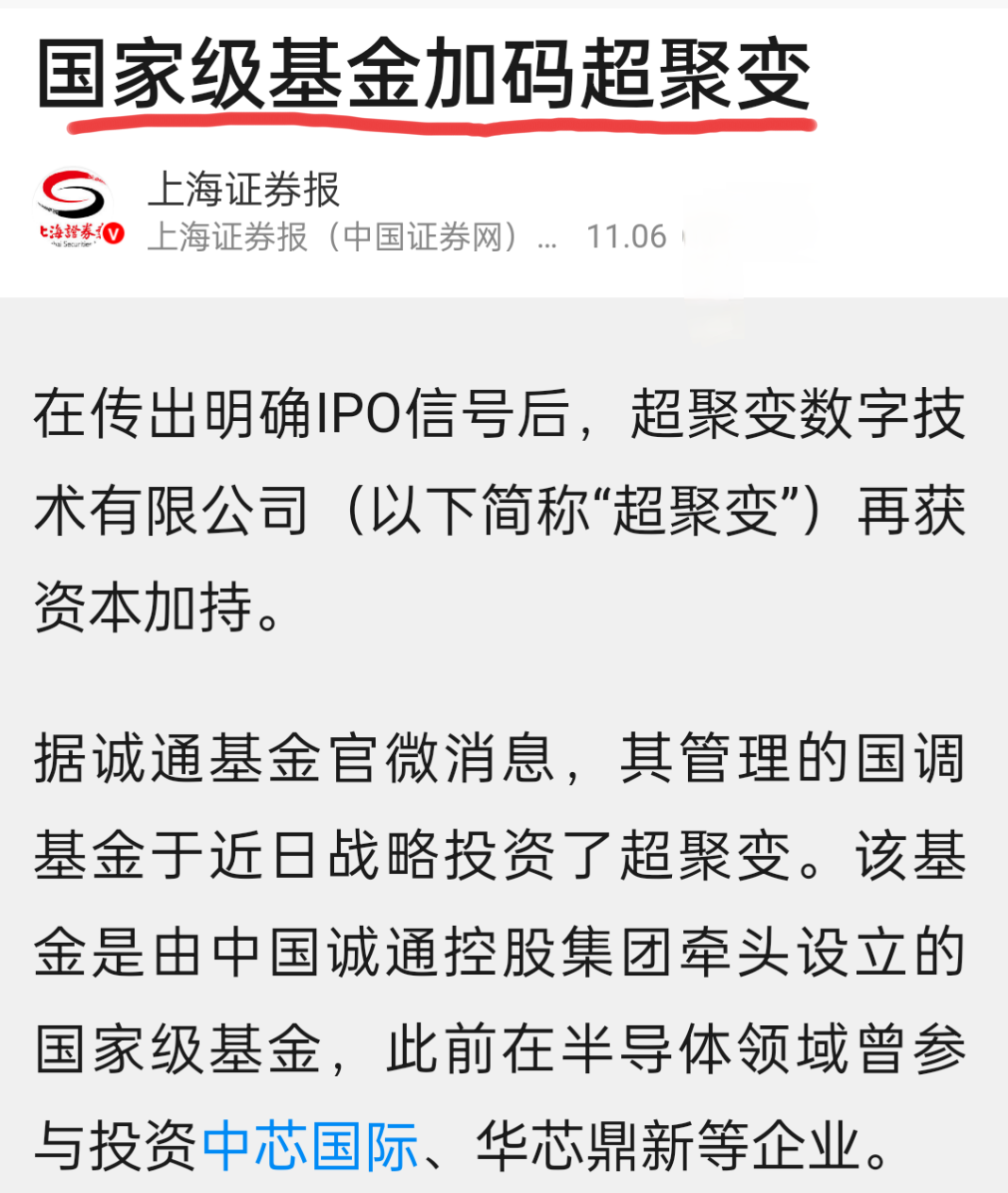 重磅新闻:国家基金加码超聚变!ST汇洲间接持有超聚变0.9649%的股权。