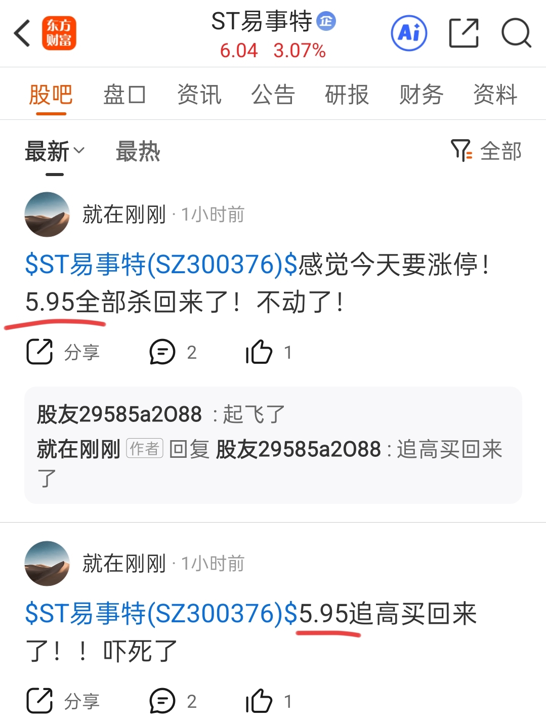 周五5.8卖掉,周一5.95接回。我就说这人认知有问题,为了几分钱的T,多花了一毛五接回。周五就预测到今天可能高开高走。还有一个月摘帽,惜筹都不卖就能不停涨。
