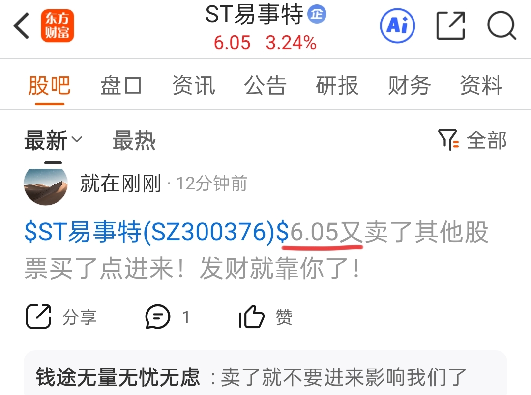 温馨提示: 1.根据《证券法》规定,禁止编造、传播虚假信息或者误导性信息,扰乱证券市场;2.用户在本社区发表的所有资料、言论等仅代表个人观点,与本网站立场无关,不对您构成任何投资建议。用户应基于自己的独立判断,自行决定证券投资并承担相应风险。《东方财富社区管理规定》