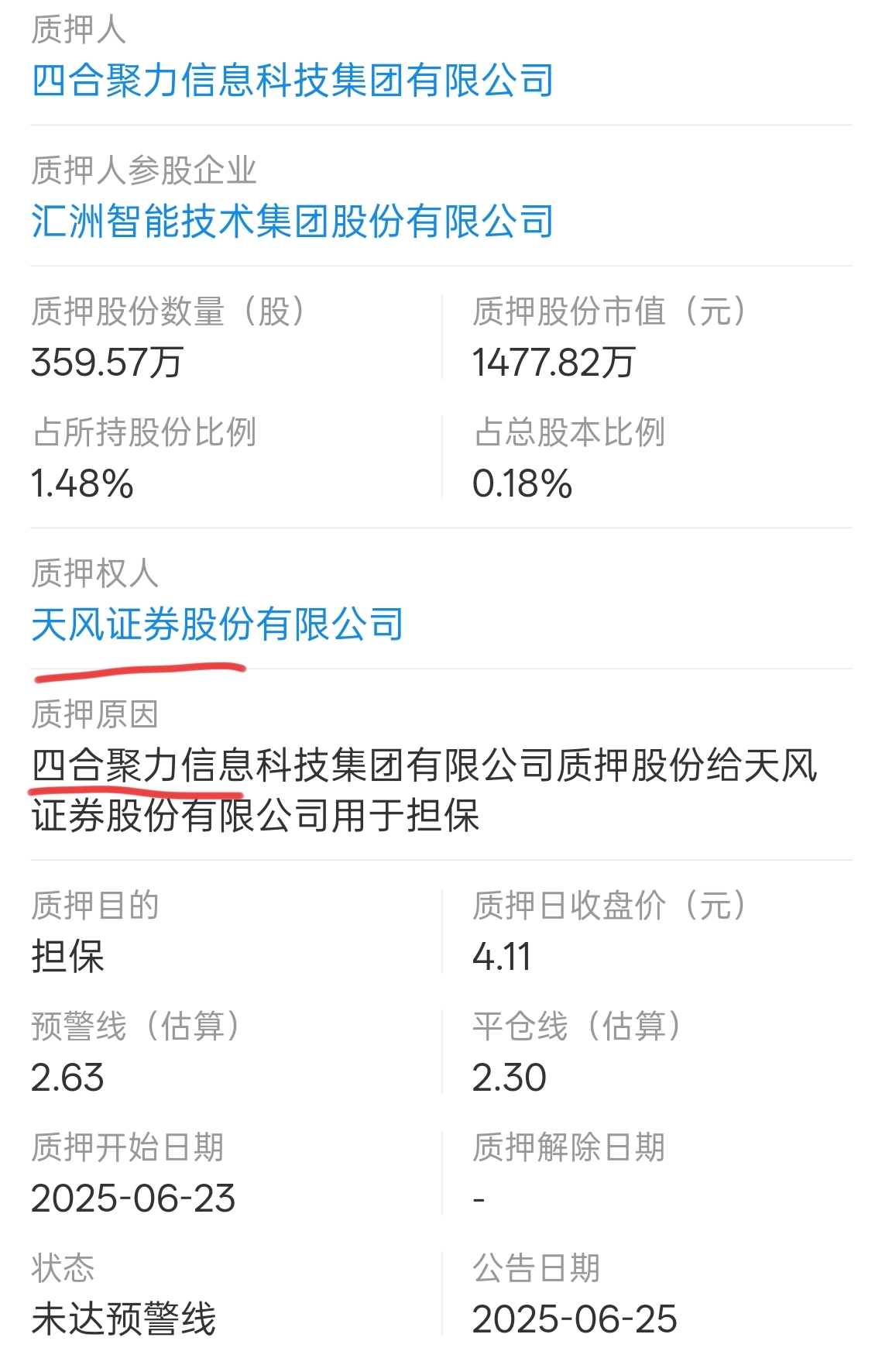 另一方面,汇洲智能第一大股东四合聚力还曾将部分股份质押给天风证券,形成了债权关联。
