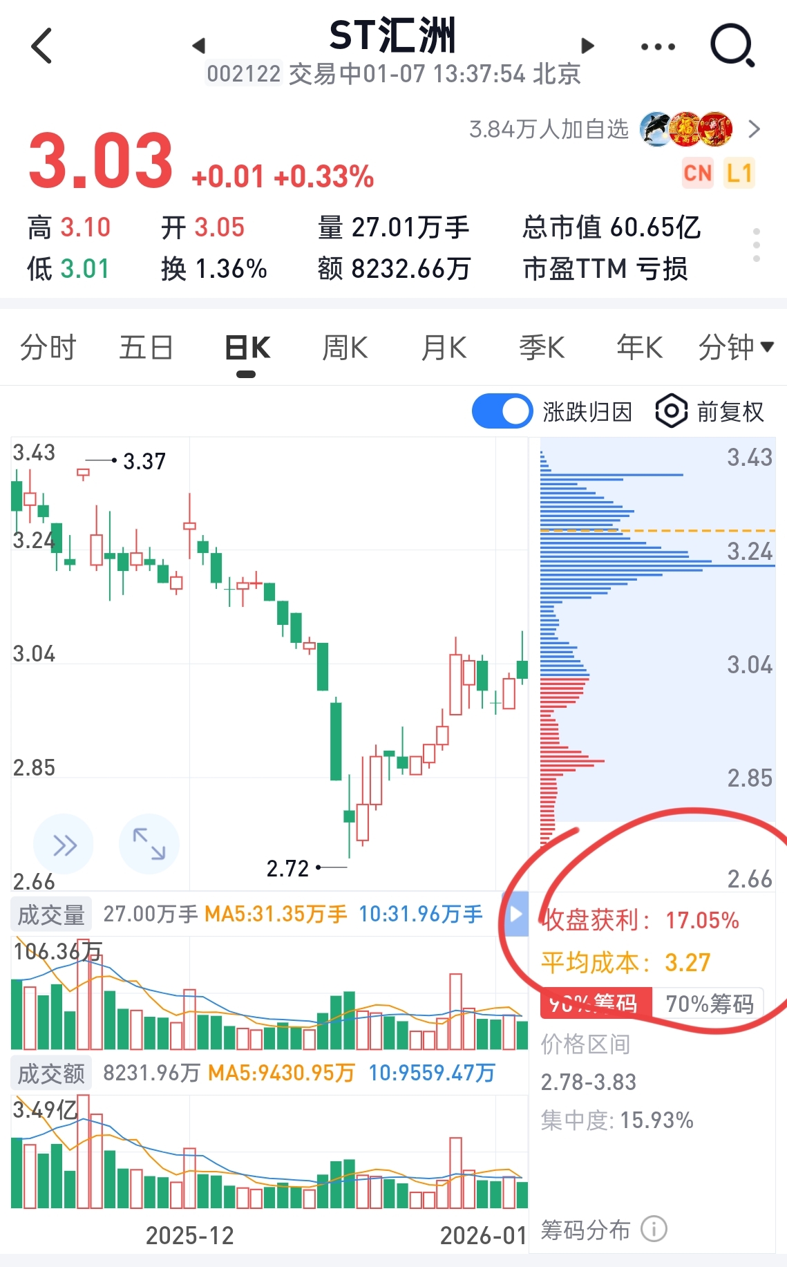$ST汇洲(SZ002122)$ 今天的筹码图,上方筹码每天松动,目前平均成本3.27了,看来下周还要再磨一个星期。
