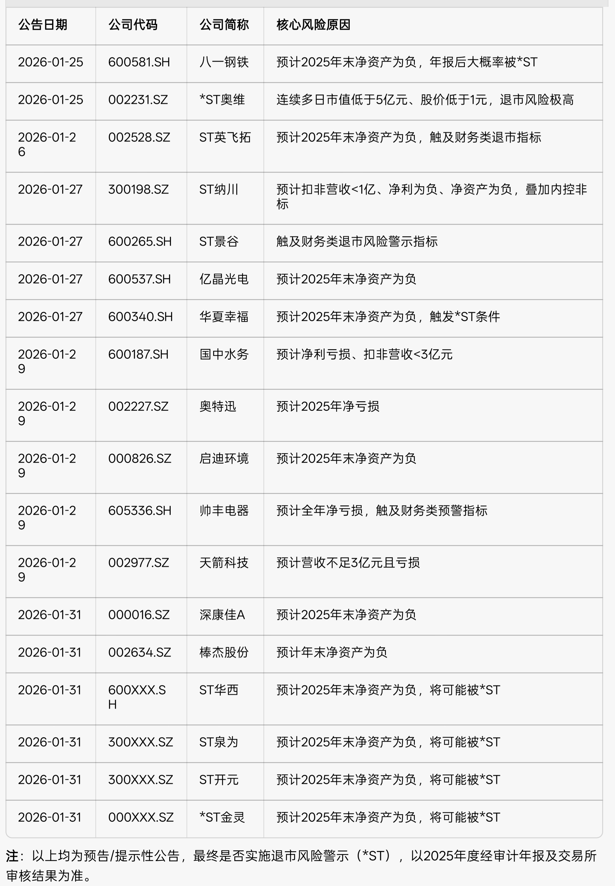 近一周(2026-01-25至2026-02-01)发布退市风险警示公司一览:2