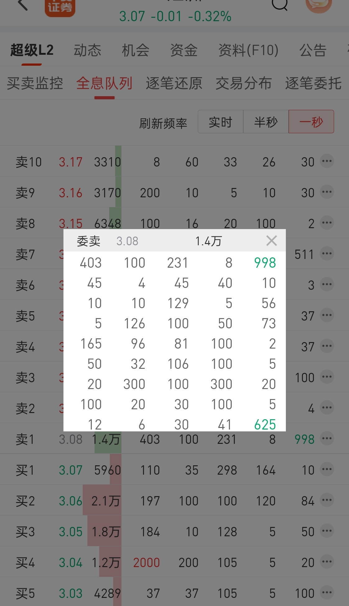 3.08价位千手挂单只有一笔。都是做T的散户?这种压单必涨