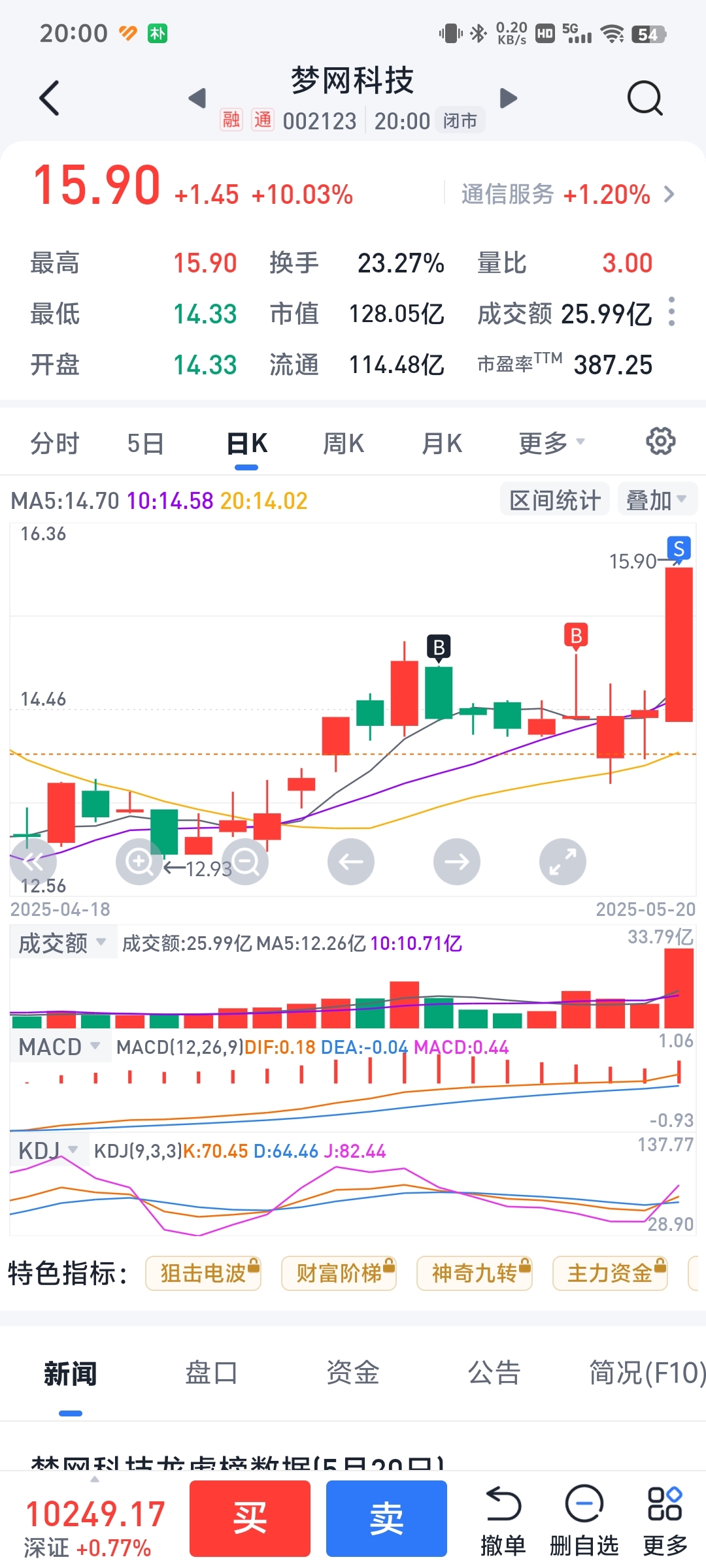 $梦网科技(SZ002123)$ 连续2次在15块附近买入,套得不要不要的。早上开盘挂涨停卖出,居然成交了,唉估计要连板了。天要下雨娘要嫁人,随他涨吧